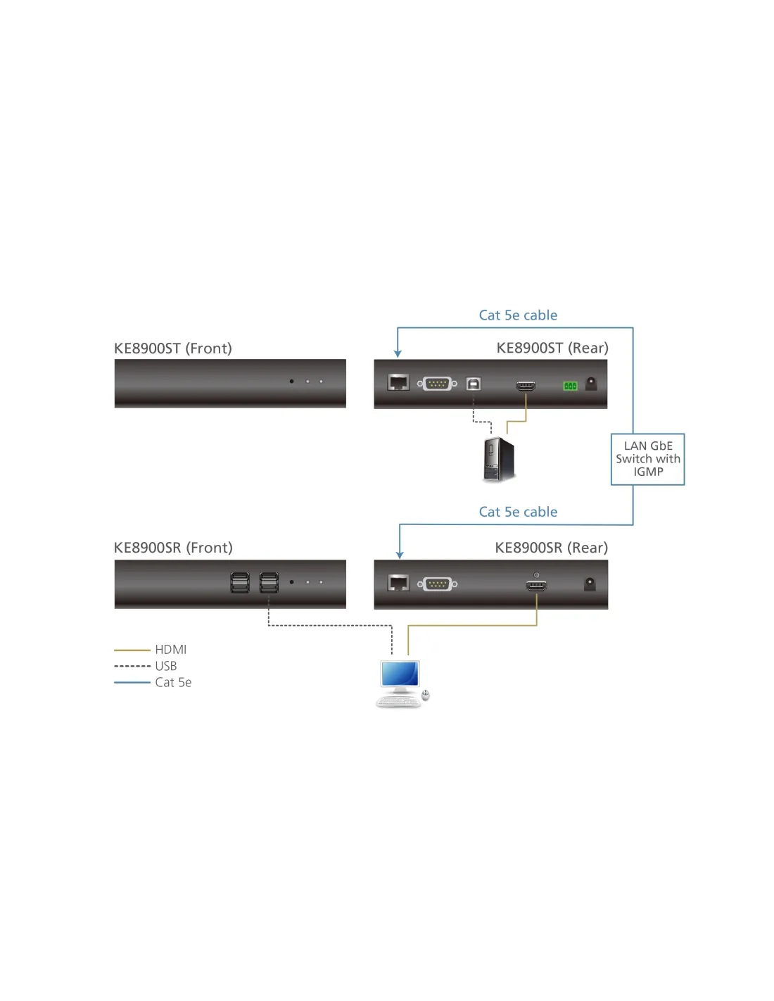 El extensor compacto KE8900S de KVM HDMI a través de IP es una combinación de transmisor (KE8900ST) / receptor (KE8900SR)compactos y asequibles basados en IP de alto rendimiento que permiten el acceso a un sistema informático desde una consola USB remota (teclado USB, ratón USB, monitor HDMI) a través de una intranet, lo que permite a los usuarios localizar ordenadores en un entorno seguro y con control de la temperatura que se encuentra aislado de la estación de trabajo de los usuarios. El KE8900ST o KE8900SR se puede vincular con cualquier receptor o transmisor de la serie KE* para crear una solución económica que se ajuste al presupuesto.