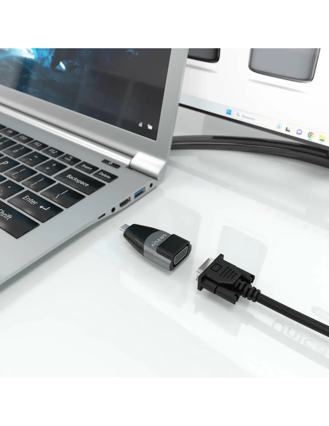 AISENS® ? Adaptador Conversor Aluminio USB-C a VGA, USB-C/M-HDB15/H, GrisConversor con carcasa de aluminio USB-C a VGA, con conector USB-C en un extremo y VGA hembra en el otro.Permite transmitir señales de una fuente USB a una pantalla VGA.Compatible con Macbook Pro, Macbook con puerto Thunderbolt 3, Google Chromebook.