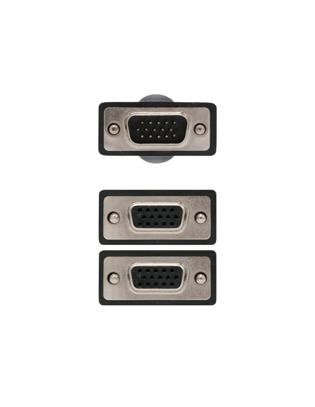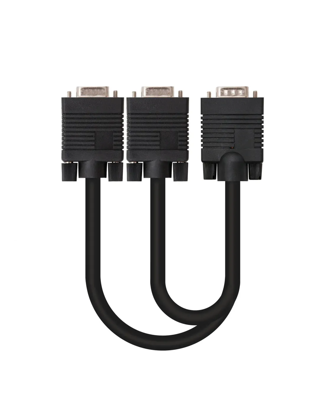 - Cable SVGA de alta calidad de formato ?Y? para duplicar la señal de salida de tu tarjeta gráfica y reproducirla en 2 monitores simultáneamente.- Conector tipo D-sub HDB15 macho en un extremo y dos conectores tipo D-sub HDB15 hembra en el otro.- 3 hilos coaxiales (doble apantallado) para señales de color de alta frecuencia más 4 hilos adicionales para la sincronización. Doble apantallado para todos los hilos para evitar pérdida de datos e interferencias electromagnéticas (EMI).- Resolución máxima 2048 X 1536- Es un cable perfecto que proporciona una imagen perfecta
