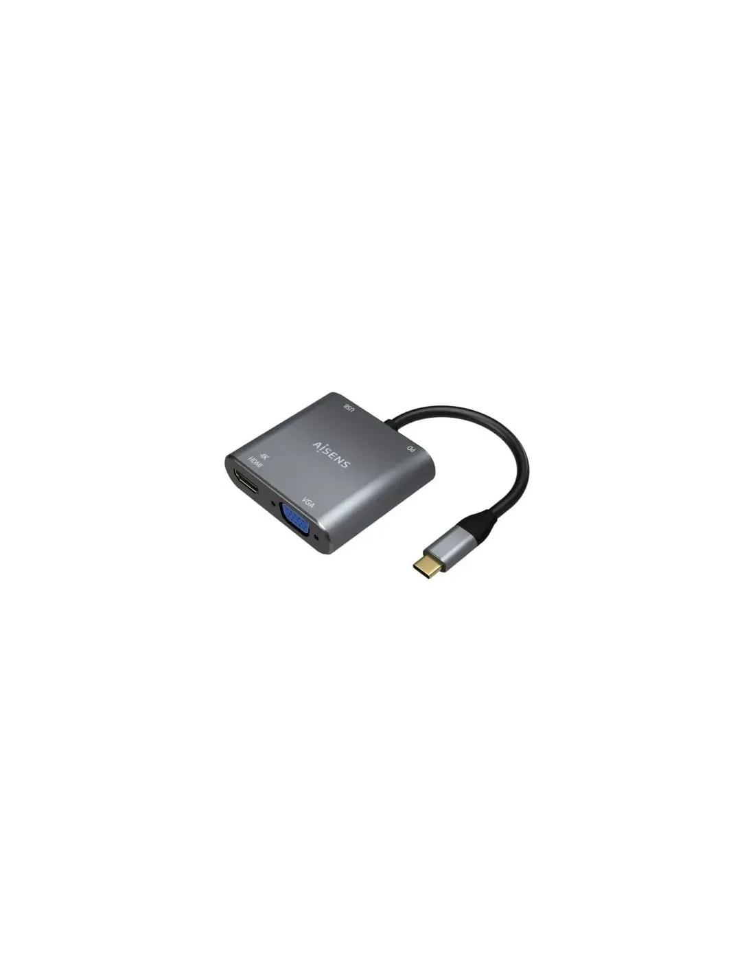 AISENS® ? Conversor USB-C a VGA/HDMI 4K/USB3.0/USB-C PD 60W, con conector USB Tipo-C macho en un extremo y VGA hembra, HDMI 4K@30Hz hembra, USB 3.0 hembra y USB-C hembra en el otro.