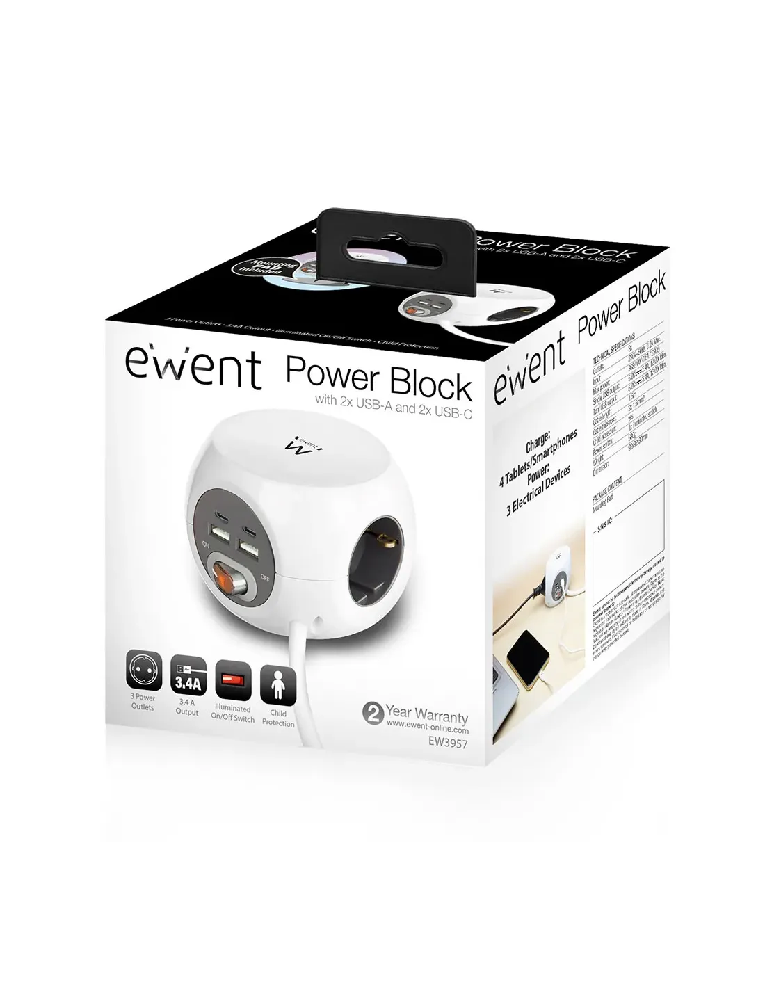 Ewent EW3957. Longitud de cable: 1,5 m, Colocación soportada: Interior, Tipo de salida AC: Tipo F. Cantidad de salidas AC: 3 salidas AC. Voltaje de entrada AC: 230 V, Máxima corriente: 16 A. Número de productos incluidos: 1 pieza(s), Tipo de embalaje: Caja, Ancho del paquete: 122 mm