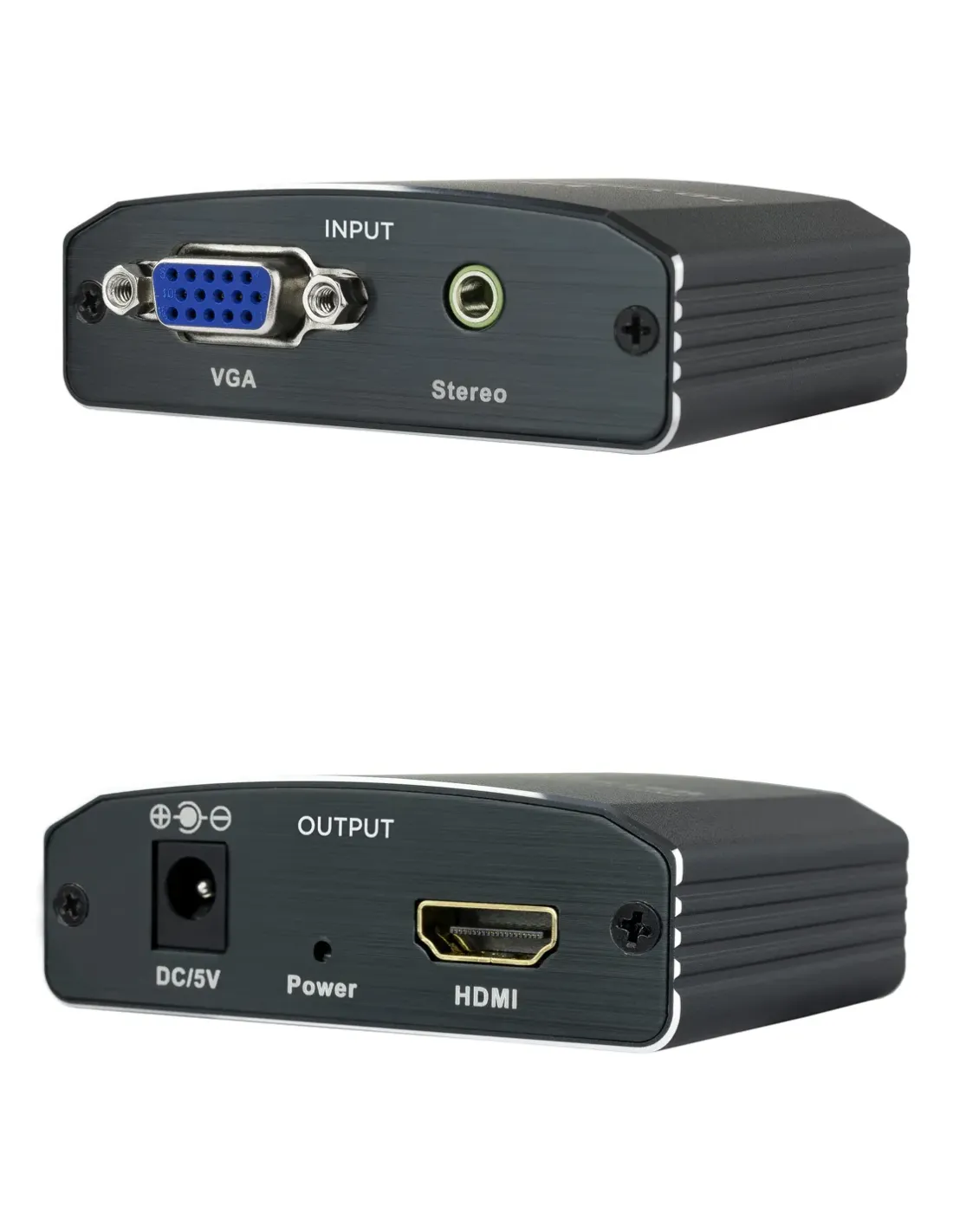 Conversor SVGA y audio a HDMI con conector HDMI hembra en un extremo y conector D-sub HDB15 hembra y Jack 3.5 hembra en el otro.