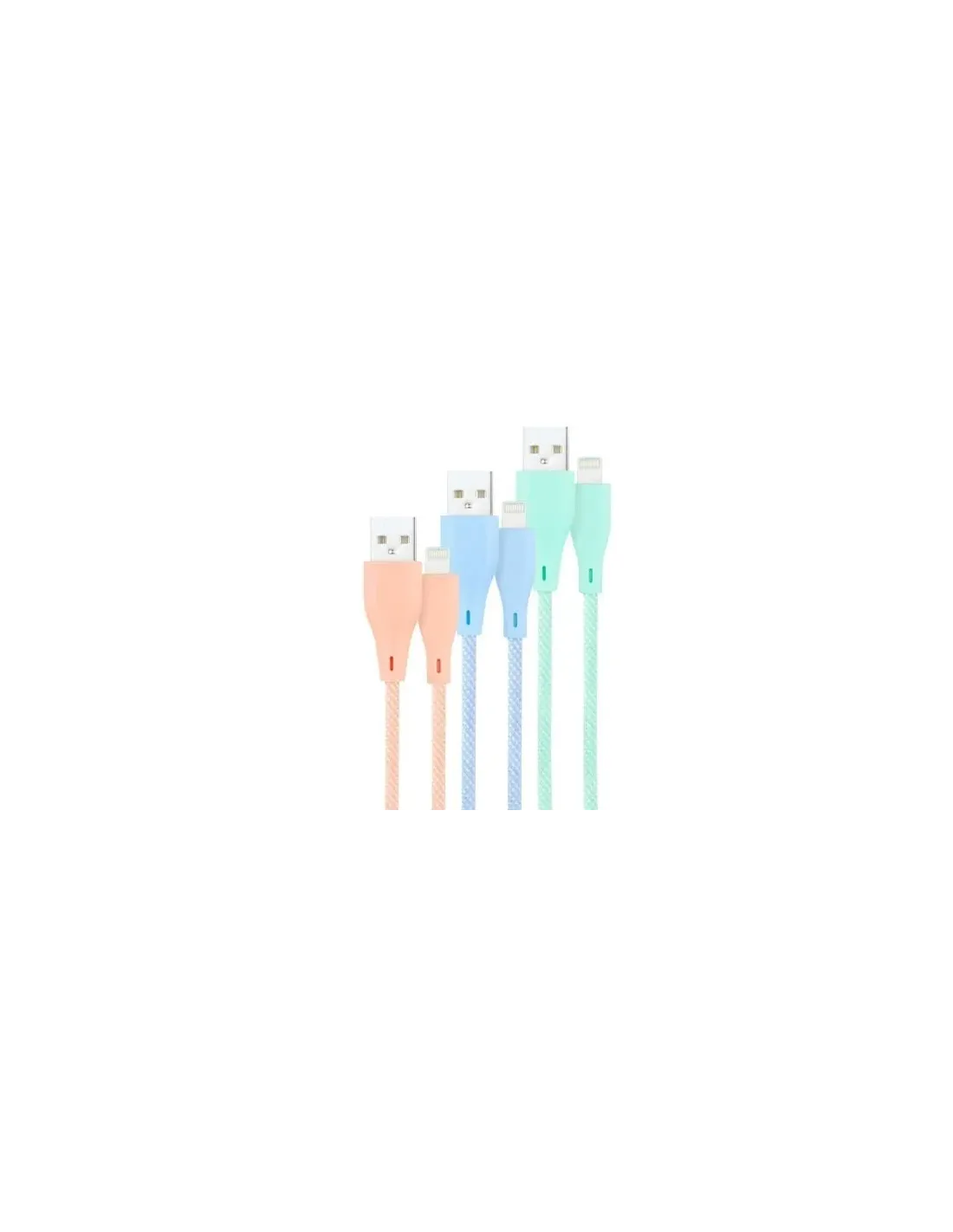 3 Cables Lightning a USB 2.0, Lightning/M-USB A/M, Mallados, Rosa, Azul y Verde, 1 m. Con conector tipo Lightning macho en un extremo y conector USB A macho en el otro. Compatible con los productos de Apple con conector Lightning.