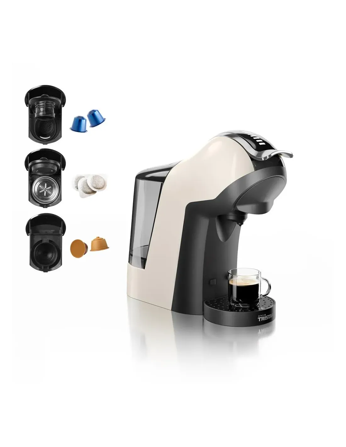 Tristar CM-2301. Tipo de producto: Macchina per caffè a capsule, Máquina de café: Semi-automática, Capacidad de reservorio de agua: 1 L, Café tipo de entrada: Cápsula de café, Capacidad en tazas: 1 tazas. Potencia: 1400 W. Color del producto: Crema de color