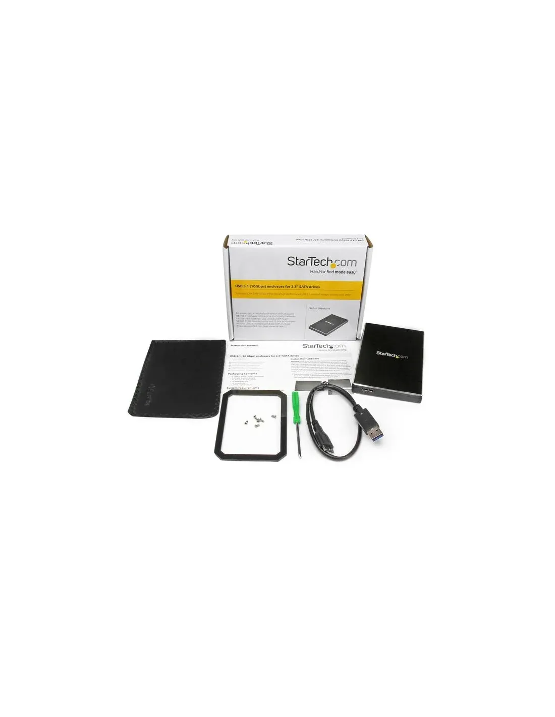 Características de la StarTech.com Caja de aluminio USB 3.1 (10Gbps) de 1 bahía de 2,5 pulgadasLa caja externa de StarTech.com está diseñada para quienes necesitan una solución robusta y eficiente para el almacenamiento portátil. Compatible con discos duros y SSDs SATA III de 2,5", esta carcasa en aluminio combina **diseño duradero**, **altas velocidades de transferencia** y una **instalación sencilla**. Ideal tanto para profesionales IT como para usuarios que buscan realizar copias de seguridad, ampliar el almacenamiento o reutilizar unidades internas.Alto rendimiento con USB 3.1 Gen 2 y UASPGracias a su interfaz USB 3.1 Gen 2 y al soporte del protocolo UASP, esta caja permite transferencias de datos **de hasta 10 Gbps**, duplicando la velocidad del USB 3.0 tradicional. Es compatible con discos duros de hasta **2 TB y 7200 RPM**, y su procesador **ASMedia ASM1351** garantiza una conexión estable y veloz en todo momento.Velocidad de transferencia de hasta 10 Gbps (USB 3.1 Gen 2)Compatibilidad con SATA III 6Gb/sCompatible con UASP para mayor eficienciaDiseño resistente y práctico en aluminioSu carcasa de **aluminio negro** no solo ofrece una excelente disipación de calor, sino que también proporciona una protección extra para tus unidades. El diseño compacto y el sistema de montaje sin herramientas facilitan el uso diario, mientras que los indicadores LED permiten controlar el estado de actividad del disco.Material: Aluminio resistenteIncluye base, destornillador y tornillosIndicador LED de actividadCompatibilidad amplia y conexión fácilLa caja está diseñada para unidades de 2,5" y soporta tanto discos duros como SSD. Con su puerto **Micro-USB tipo B de 10 pines** y cable USB incluido, la conexión a tu equipo es directa y sin complicaciones. Además, su compatibilidad con distintos modelos StarTech.com permite integrarla fácilmente en entornos profesionales.Conexión USB 3.1 Gen 2 con cable incluidoDiseñada para discos de 2,5" (HDD y SSD)Soporte de hasta 2 TBAlimentación y entorno operativoIncluye adaptador de corriente compatible con voltajes de **120/230 V**, asegurando un suministro estable en cualquier entorno. Está preparada para trabajar en un amplio rango de condiciones, desde oficinas hasta espacios técnicos exigentes.Alimentación: Adaptador CA incluidoTemperatura de funcionamiento: 0 °C a 40 °CHumedad operativa: 10% a 95%Otras especificacionesBahía interna: 1 x 2,5"Interfaz interna: SATA combo 6Gb/sDimensiones: 11,54 cm x 19,15 cm x 3,14 cmPeso: 320 gCertificaciones: FCC, RoHSDiseñada para: P/N BNDTBUSB3142, PEXUSB311AC2, entre otros