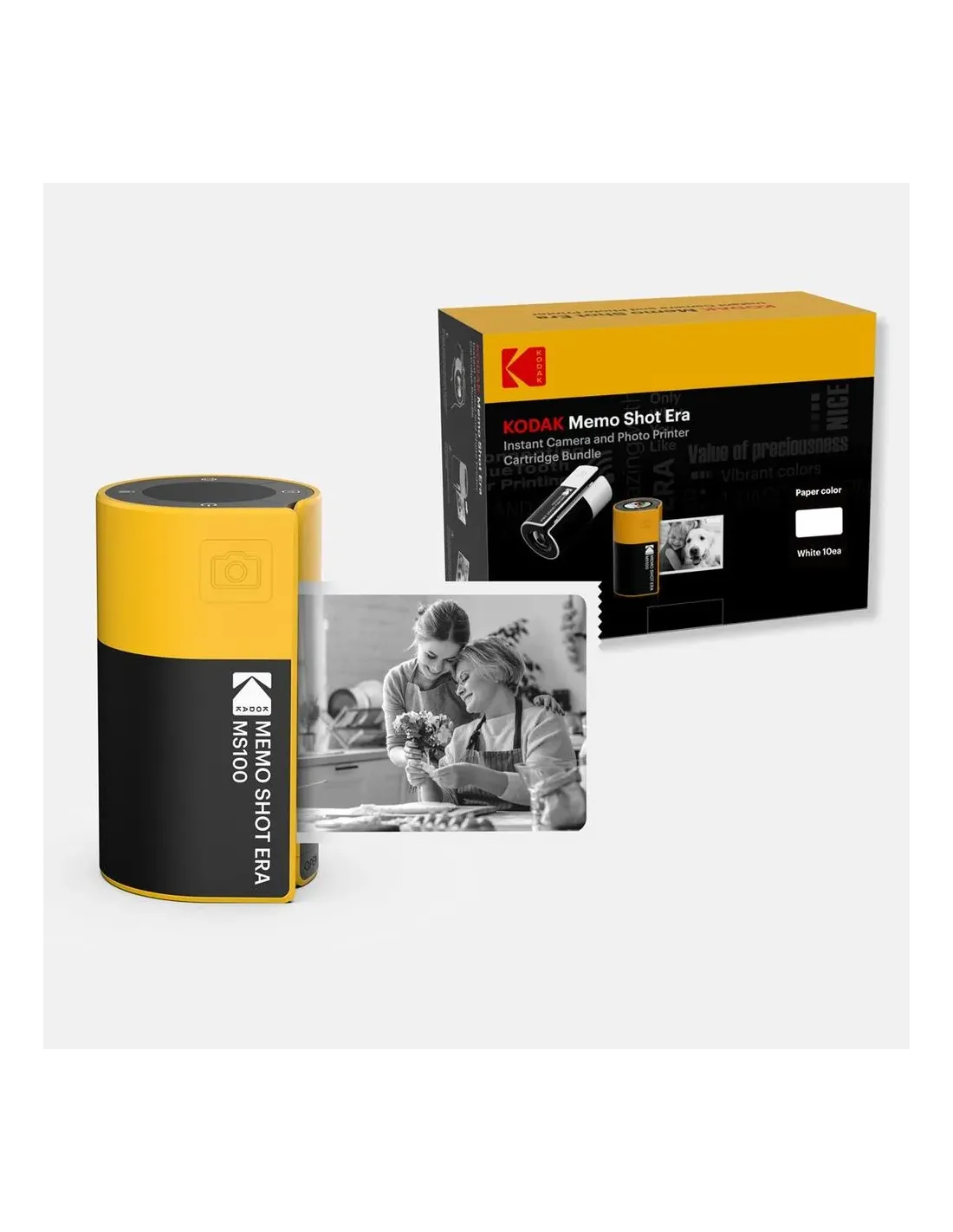 Características de la Cámara de Fotos Instantánea Kodak MemoShot Era MS100 Combo con 9 Rollos de PapelLa Kodak MemoShot Era MS100 es una cámara de fotos instantánea con impresión térmica diseñada para quienes buscan capturar y compartir recuerdos al momento sin complicaciones. Gracias a su tecnología sin tinta, conectividad Bluetooth y formato compacto, es perfecta para uso personal, creativo o familiar. Este combo incluye 9 rollos de papel fotográfico, para que puedas empezar a imprimir desde el primer día.Impresión térmica sin tintaLa tecnología de impresión térmica elimina la necesidad de cartuchos de tinta, ofreciendo un sistema más limpio, económico y fácil de mantener. Solo necesitas papel térmico para obtener tus fotos al instante.Tecnología de impresión: Térmica (no requiere tinta)Funcionamiento sencillo y mantenimiento mínimoImpresión rápida directamente desde la cámara o el móvilFotos adhesivas listas para usarImprime fotografías en formato compacto y autoadhesivo, ideal para decorar agendas, cuadernos, fundas o crear recuerdos personalizados. Su tamaño práctico permite llevarlas contigo y utilizarlas en cualquier momento.Tamaño de impresión: 2,7 x 1,8 pulgadas (aprox. 7 x 4,5 cm)Formato autoadhesivoIdeal para scrapbooking, organización o decoraciónConectividad Bluetooth para imprimir desde el móvilGracias a su conectividad Bluetooth, puedes imprimir directamente desde tu smartphone, ya sea iOS o Android. Comparte tus mejores momentos y transfórmalos en fotografías físicas en segundos.Conexión Bluetooth integradaCompatible con dispositivos iOS y AndroidImpresión sencilla desde el teléfono móvilBatería recargable por USB-CSu batería interna recargable proporciona autonomía para imprimir en cualquier lugar. La carga mediante USB-C garantiza una conexión moderna y cómoda.Batería interna recargableCarga mediante cable USB-C incluidoUso portátil sin depender de enchufes constantesContenido del paqueteEste combo incluye todo lo necesario para empezar a utilizar la cámara desde el primer momento, con un amplio suministro de papel.Cámara térmica instantánea Kodak MemoShot Era MS100Cable USB-C para carga9 rollos de papel térmico para impresiónGuía de inicio rápido / manual de usuario