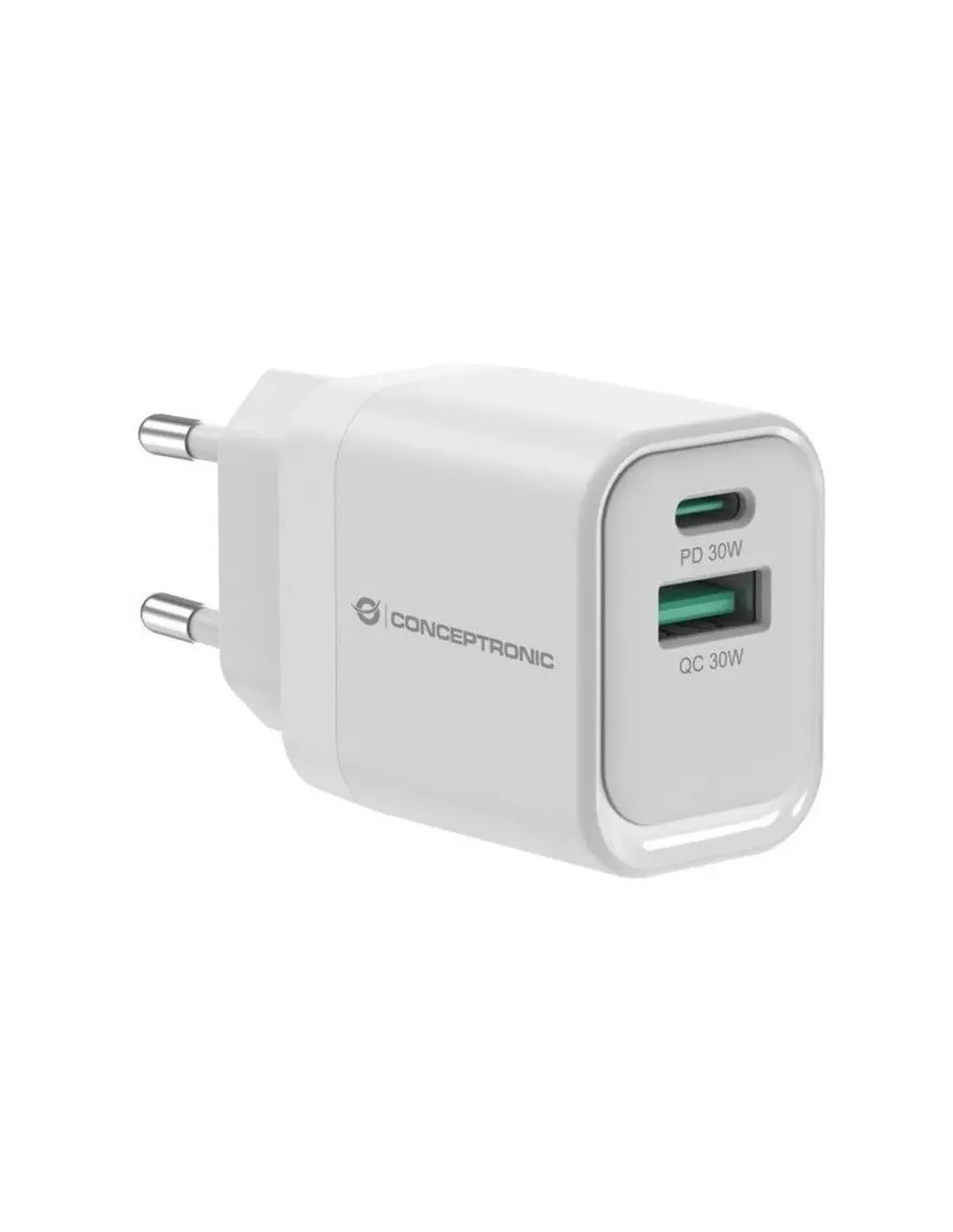 Características del Cargador USB Conceptronic 33W ALTHEA1933El **Conceptronic ALTHEA1933** es un cargador compacto de alto rendimiento, diseñado para usuarios que necesitan **potencia, versatilidad y seguridad** en un formato ultraligero. Con **tecnología GaN** de última generación, carga rápida dual y materiales resistentes, es ideal tanto para uso diario como para viajes.Potencia compacta con tecnología GaNGracias al uso de **Nitruro de Galio (GaN)**, este cargador consigue ofrecer hasta **33W de potencia** en un diseño compacto y ligero, sin comprometer el rendimiento. Esta tecnología mejora la eficiencia y permite una carga más rápida con menor generación de calor.Potencia total: hasta 33WDiseño compacto: solo 42,5 x 40 x 29 mmPeso ligero: 57,3 gramosCarga dual simultánea con USB-C y USB-AEquipa dos salidas independientes: un **USB-C con Power Delivery 3.0** y un **USB-A con Quick Charge 3.0**, permitiendo cargar dos dispositivos al mismo tiempo con total compatibilidad para smartphones, tablets, auriculares o incluso algunos portátiles compactos.1x USB-C PD 3.0: hasta 20V / 1.5A1x USB-A QC 3.0: hasta 12V / 1.5ACompatible con carga simultáneaAdaptabilidad y eficiencia con PPSIntegra soporte completo para la tecnología **PPS (Programmable Power Supply)**, que ajusta dinámicamente el voltaje y la corriente para **optimizar la carga** y reducir la emisión de calor. Esto garantiza una mayor eficiencia y protege la batería de los dispositivos.Rango PPS: 3.3V a 11.0V / 3.0AMenor generación de calorCompatibilidad con dispositivos Samsung y otros con PPSSeguridad certificada para una carga fiableFabricado con una **carcasa de policarbonato resistente** y sistemas de protección avanzados contra sobrecalentamiento, cortocircuitos y sobrecarga, el cargador cumple con las normativas **CE, RoHS y ERP**, asegurando un uso duradero y sin riesgos.Protección térmica y eléctrica integradaCarcasa de policarbonato (PC)Certificaciones: CE, RoHS, ERPDiseño práctico y orientado al viajeGracias a su tamaño reducido y peso liviano, el ALTHEA1933 es perfecto para llevar en cualquier bolsa, mochila o maleta. Ideal para viajeros, estudiantes o profesionales que necesitan un cargador de alto rendimiento en cualquier lugar.Voltaje de entrada universal: 100-240VFrecuencia: 50-60 HzContenido: cargador + guía rápida multilingüeOtras especificacionesCorriente de entrada: 0.8A (máx.)Temperatura operativa: 0°C ~ 35°CHumedad operativa: 20% RH ~ 80% RHTemperatura de almacenamiento: -20°C ~ 80°CHumedad de almacenamiento: 10% RH ~ 90% RHCódigo HS: 850440Código TARIC: 8504408390