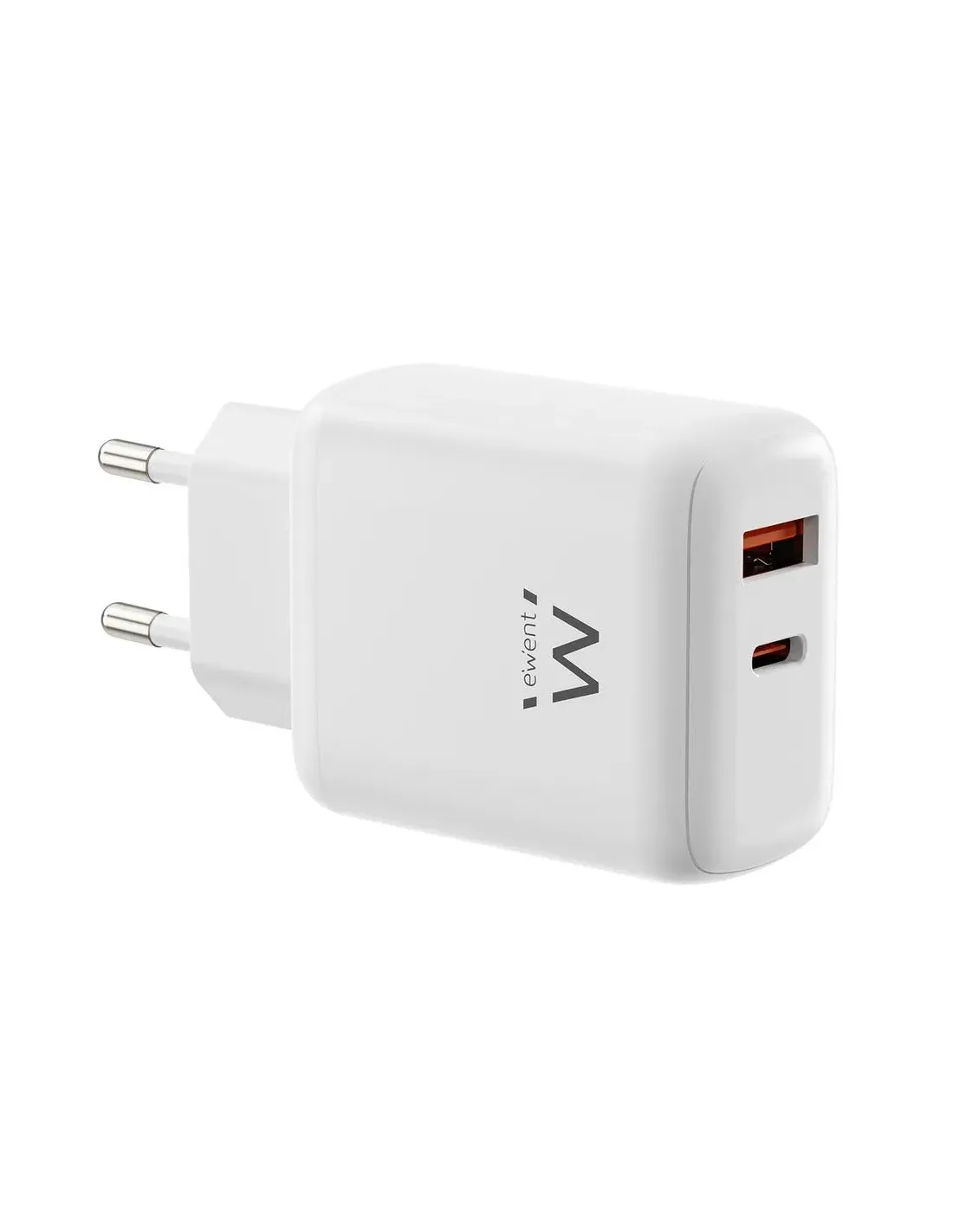 Características del Cargador Rápido GaN de 45W USB-C PD y USB-A QC EW1329El cargador rápido Ewent EW1329 de 45W es una solución versátil y potente para usuarios que necesitan cargar múltiples dispositivos de forma eficiente. Diseñado para smartphones, tablets y portátiles, es compatible con dispositivos Apple como iPhone y MacBook, así como con equipos Android. Gracias a su tecnología GaN y su diseño compacto, ofrece un alto rendimiento en cualquier entorno.Carga rápida y eficiente de hasta 45WEste cargador incorpora Power Delivery 3.0 y Quick Charge 3.0, permitiendo una carga rápida y optimizada según el dispositivo conectado. Es capaz de alcanzar hasta un 75% de carga en solo 30 minutos, ideal para usuarios con ritmo diario exigente.Potencia máxima de salida: 45WUSB-C con Power Delivery 3.0 y PPSUSB-A con Quick Charge 3.0Tecnología GaN: más potencia en menos espacioGracias al uso de nitruro de galio (GaN), este cargador ofrece una mayor eficiencia energética y reduce significativamente el tamaño sin comprometer el rendimiento. Esto se traduce en un dispositivo compacto, ligero y fácil de transportar.Tecnología GaN FastDiseño compacto y ligero (80 g)Dimensiones: 48 x 28,4 x 93,5 mmCarga simultánea para varios dispositivosEl EW1329 permite cargar dos dispositivos al mismo tiempo gracias a sus puertos USB-C y USB-A. Ajusta automáticamente la distribución de energía para ofrecer una carga segura y eficiente en cada conexión.1x USB-C Power Delivery1x USB-A Quick Charge 3.0Carga dual inteligenteCompatibilidad universalEste cargador está diseñado para ofrecer máxima compatibilidad con una amplia gama de dispositivos, desde smartphones hasta portátiles y accesorios electrónicos.Compatible con iPhone, iPad y MacBookSoporte para dispositivos Android con Power DeliveryCompatible con auriculares, baterías externas y consolas portátilesSeguridad avanzada y protección inteligenteIntegra sistemas de protección que garantizan una carga segura en todo momento, deteniendo automáticamente el suministro cuando la batería está completa y evitando daños por sobrecarga o temperatura.Protección contra sobrecorriente, sobretensión y sobrecargaControl de temperatura integradoApagado automático al completar la cargaOtras especificaciones técnicasEntrada: 110 - 240V AC 1,2A máx.USB-C: hasta 45W (5V/9V/12V/15V/20V y PPS 5-11V)USB-A: hasta 18W (QC 3.0)Salida combinada: hasta 30W USB-C + 12W USB-ACompatibilidad de protocolos: PD3.0, PPS, QC2.0/3.0/4+, AFC, FCP, SCP, Apple 2.4A, BC1.2Color: BlancoConector: CEE 7/16 (Euro)EAN: 8052101435481