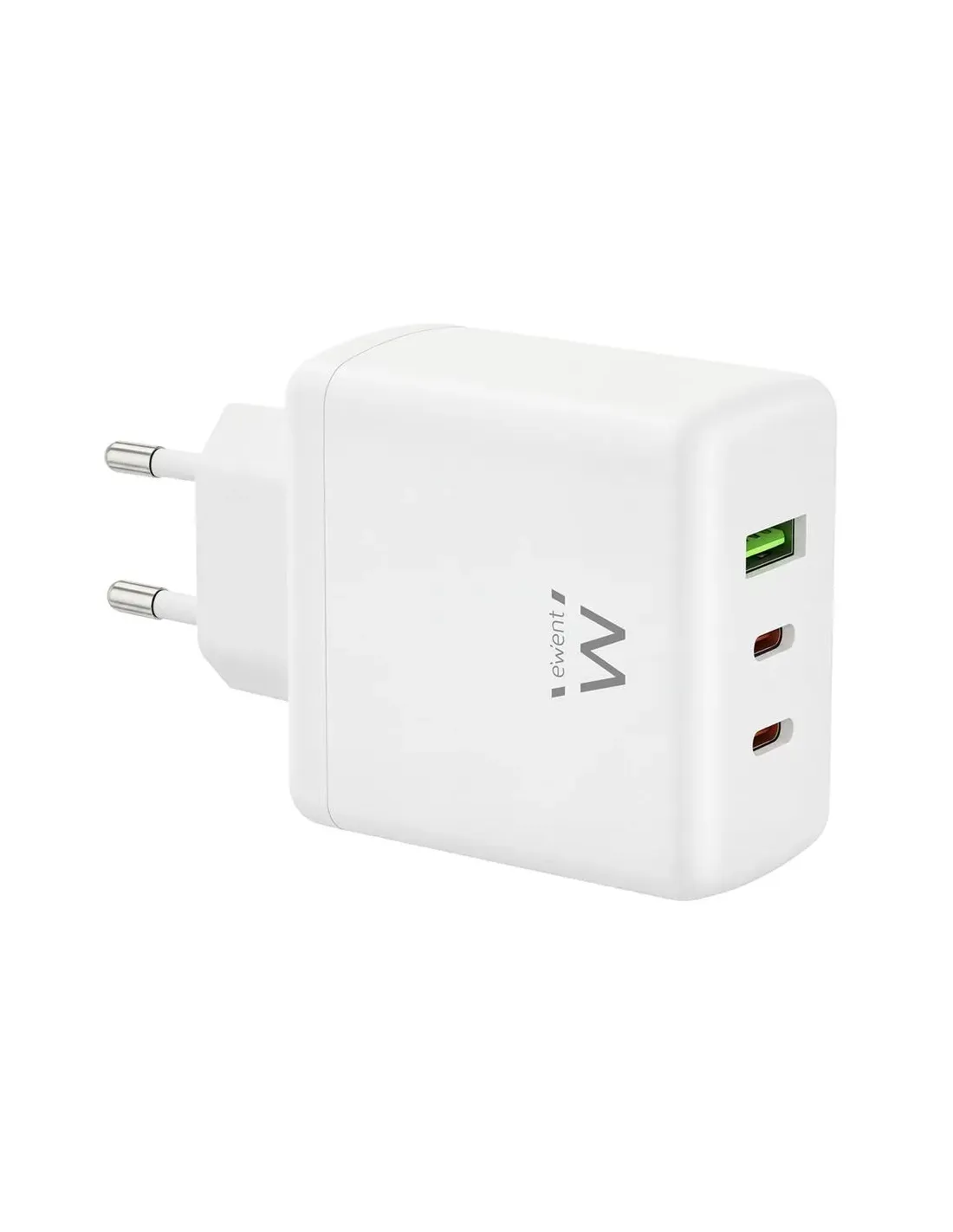 Características del Cargador Rápido GaN de 65W Ewent EW1333El Ewent EW1333 es un cargador rápido de 65W con tecnología GaN, diseñado para ofrecer máxima potencia en un formato compacto. Gracias a sus 3 puertos (2 USB-C Power Delivery y 1 USB-A Quick Charge), permite cargar simultáneamente smartphones, tablets, portátiles y otros dispositivos, siendo una solución ideal tanto para uso diario como para viajes. Compatible con dispositivos Apple y Android, garantiza una carga eficiente, rápida y segura.Carga rápida de alto rendimiento hasta 65WDisfruta de una carga ultrarrápida capaz de alcanzar hasta el 75% de batería en solo 30 minutos en dispositivos compatibles. El puerto USB-C principal ofrece hasta 65W, ideal para portátiles, mientras que el resto de puertos permiten cargar otros dispositivos sin perder eficiencia.Potencia máxima: 65WUSB-C Power Delivery 3.0Carga rápida para smartphones, tablets y portátiles3 puertos para carga simultáneaEquipado con dos puertos USB-C y un puerto USB-A, este cargador permite alimentar hasta tres dispositivos al mismo tiempo. Es perfecto para usuarios que necesitan cargar varios equipos como MacBook, iPhone, auriculares o consolas con un solo adaptador.2x USB-C con Power Delivery1x USB-A con Quick Charge 3.0Carga simultánea de hasta 3 dispositivosTecnología GaN Fast: más potencia en menos espacioGracias al uso de nitruro de galio (GaN), este cargador ofrece mayor eficiencia energética y menor generación de calor, todo en un diseño más compacto y ligero que los cargadores tradicionales.Tecnología GaN de alta eficienciaMenor tamaño y pesoMejor disipación del calorCompatibilidad total con Apple y AndroidEl Ewent EW1333 está diseñado para funcionar con una amplia variedad de dispositivos, incluyendo iPhone de última generación, iPad, MacBook y dispositivos Android. Su sistema inteligente ajusta la potencia según el equipo conectado.Compatible con iPhone 17 y anterioresSoporte para dispositivos Android con Power DeliveryCompatible con tablets, auriculares, power banks y consolasTecnología PPS para carga optimizadaIncorpora PPS (Programmable Power Supply), una tecnología avanzada que ajusta dinámicamente voltaje y corriente para maximizar la eficiencia y reducir el desgaste de la batería.Ajuste dinámico de potenciaMenor generación de calorMayor vida útil de la bateríaSeguridad avanzada y diseño compactoEste cargador incluye sistemas de protección integrados que garantizan un uso seguro en todo momento, además de un diseño compacto perfecto para llevar en la mochila o maletín.Protección contra sobrecorriente, sobretensión, sobrecarga y temperaturaDetención automática de carga al completar la bateríaDimensiones: 59 x 32 x 94 mmPeso: 97 gOtras especificaciones técnicasEntrada: 110 - 240V AC 1,2A MaxConector: CEE 7/16 (Euro)Color: BlancoUSB-C1 hasta 65W con PD3.0 y PPSUSB-C2 hasta 18WUSB-A hasta 18W (QC 3.0)Compatibilidad: PD3.0, PPS, QC2.0/3.0/4+, AFC, FCP, SCP, Apple 2.4A, BC1.2Salida combinada máxima: 65W (distribuida según puertos)EAN: 8052101435498