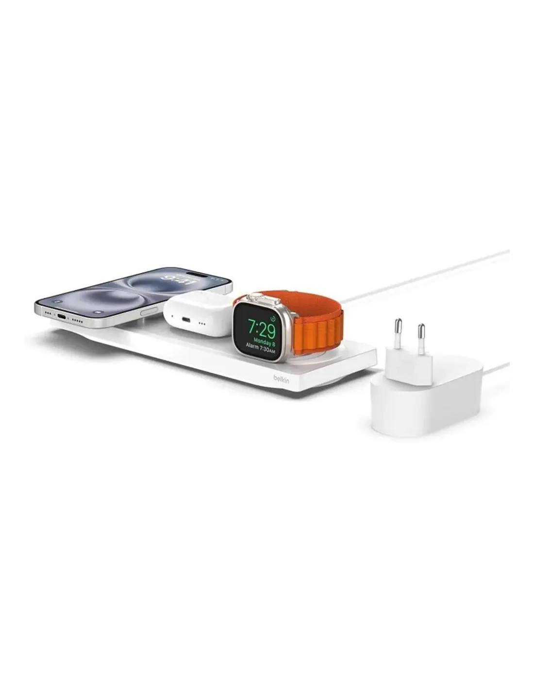 Características de la Base de Carga Inalámbrica Belkin WIZ016vfWH MagSafe 3 en 1La base de carga inalámbrica Belkin WIZ016vfWH está diseñada para usuarios de Apple que buscan una solución de carga elegante, eficiente y sin cables. Gracias a su tecnología MagSafe, permite cargar simultáneamente un iPhone, unos AirPods y un Apple Watch, todo desde un mismo punto. Es ideal para quienes desean mantener su espacio ordenado y su ecosistema Apple siempre listo para usar.Carga inalámbrica 3 en 1 con MagSafeEsta estación permite cargar tres dispositivos Apple al mismo tiempo de forma rápida y segura. Su sistema de alineación magnética automática asegura un acoplamiento perfecto con el iPhone, optimizando la eficiencia de carga sin necesidad de cables.Compatible con iPhone 12, 13 y modelos posteriores con MagSafeBase dedicada para Apple Watch y AirPodsDiseño compacto y minimalista en color blancoBatería externa magnética BoostCharge de 2500 mAhIncluye una batería portátil que se acopla magnéticamente al iPhone para ofrecer una carga rápida adicional, ideal para uso diario o en movimiento. No interfiere con la cámara, por lo que puedes seguir tomando fotos o grabando vídeos mientras cargas.Capacidad de 2500 mAhHasta 8,5 horas adicionales de reproducción de vídeoCarga simultánea del móvil y de la batería (función pass-through)Conectividad USB-C y compatibilidad totalLa carga se realiza mediante un puerto USB-C (cable incluido), aunque requiere un adaptador de corriente de al menos 20W (no incluido). Es totalmente compatible con fundas oficiales MagSafe, lo que garantiza una experiencia sin interrupciones.Puerto USB Tipo C para entrada/salidaCable USB-C a USB-C de 1 metro incluidoRequiere adaptador de corriente USB-C de 20W o superiorDiseño portátil, seguro y optimizadoLa forma rectangular y su delgadez hacen que esta base de carga sea ideal para llevarla a cualquier parte. Los indicadores LED te informan en todo momento del estado de la batería, y su diseño está pensado para no bloquear la cámara del iPhone durante el uso.Dimensiones: 65 mm x 13 mm x 97 mmAcoplamiento magnético seguro y rápidoIndicador LED de estado de cargaContenido de la cajaBatería externa inalámbrica magnética BoostCharge 2500 mAh (BPD002)Cable USB-C a USB-C de 1 metroOtras especificacionesTipo de carga: Inalámbrica magnética con tecnología MagSafeDispositivos soportados: iPhone, Apple Watch, AirPodsNúmero máximo de dispositivos conectados simultáneamente: 3