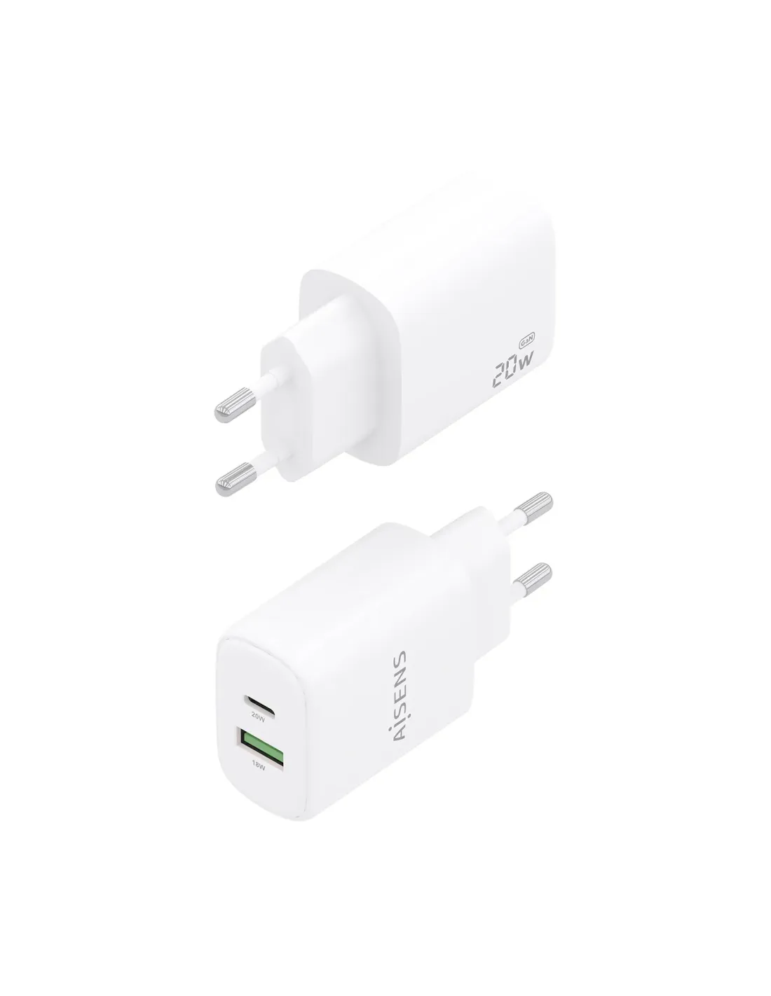 AISENS Cargador GaN 20W, 1xUSB-C PD3.0, 1xUSB-A QC3.0, Blanco, Interior, Corriente alterna, Blanco