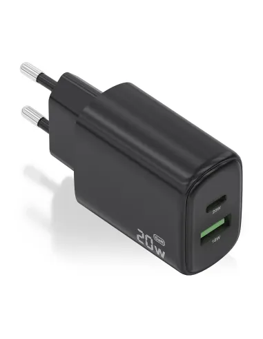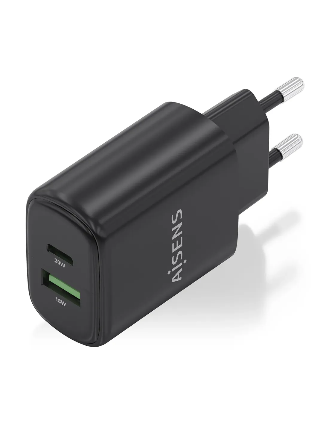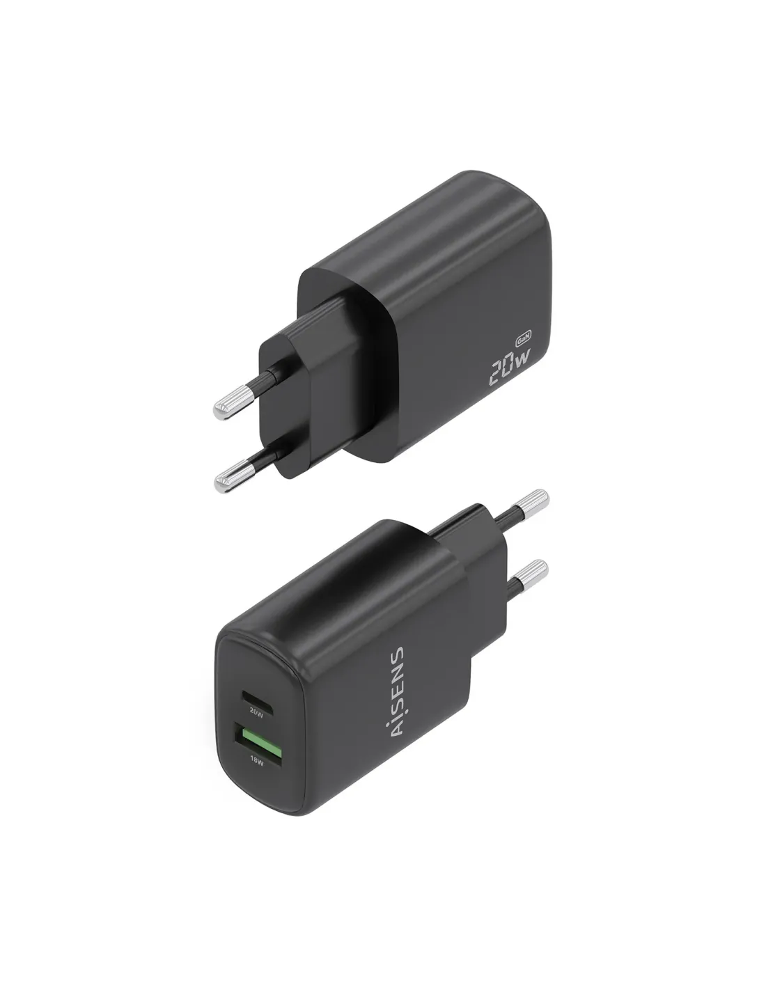 AISENS Cargador GaN 20W, 1xUSB-C PD3.0, 1xUSB-A QC3.0, Negro