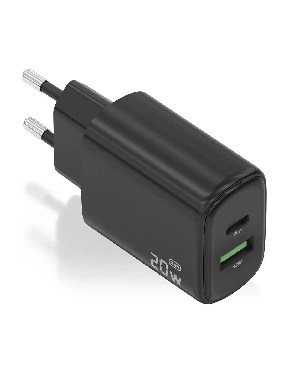 AISENS Cargador GaN 20W, 1xUSB-C PD3.0, 1xUSB-A QC3.0, Negro, Interior, Corriente alterna, Negro