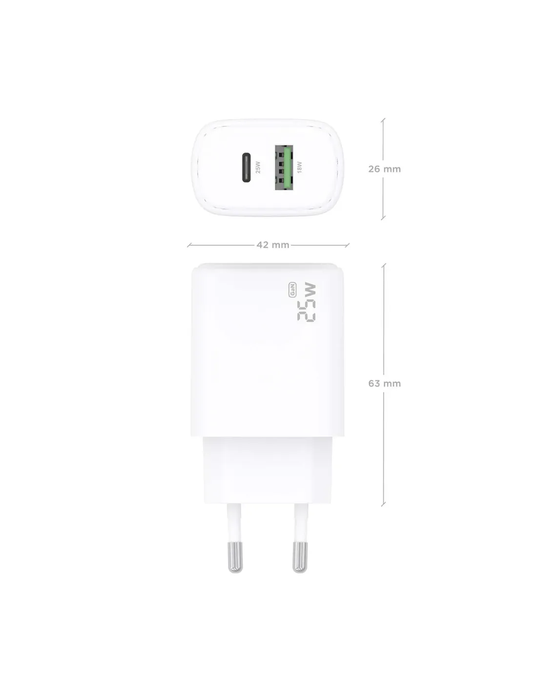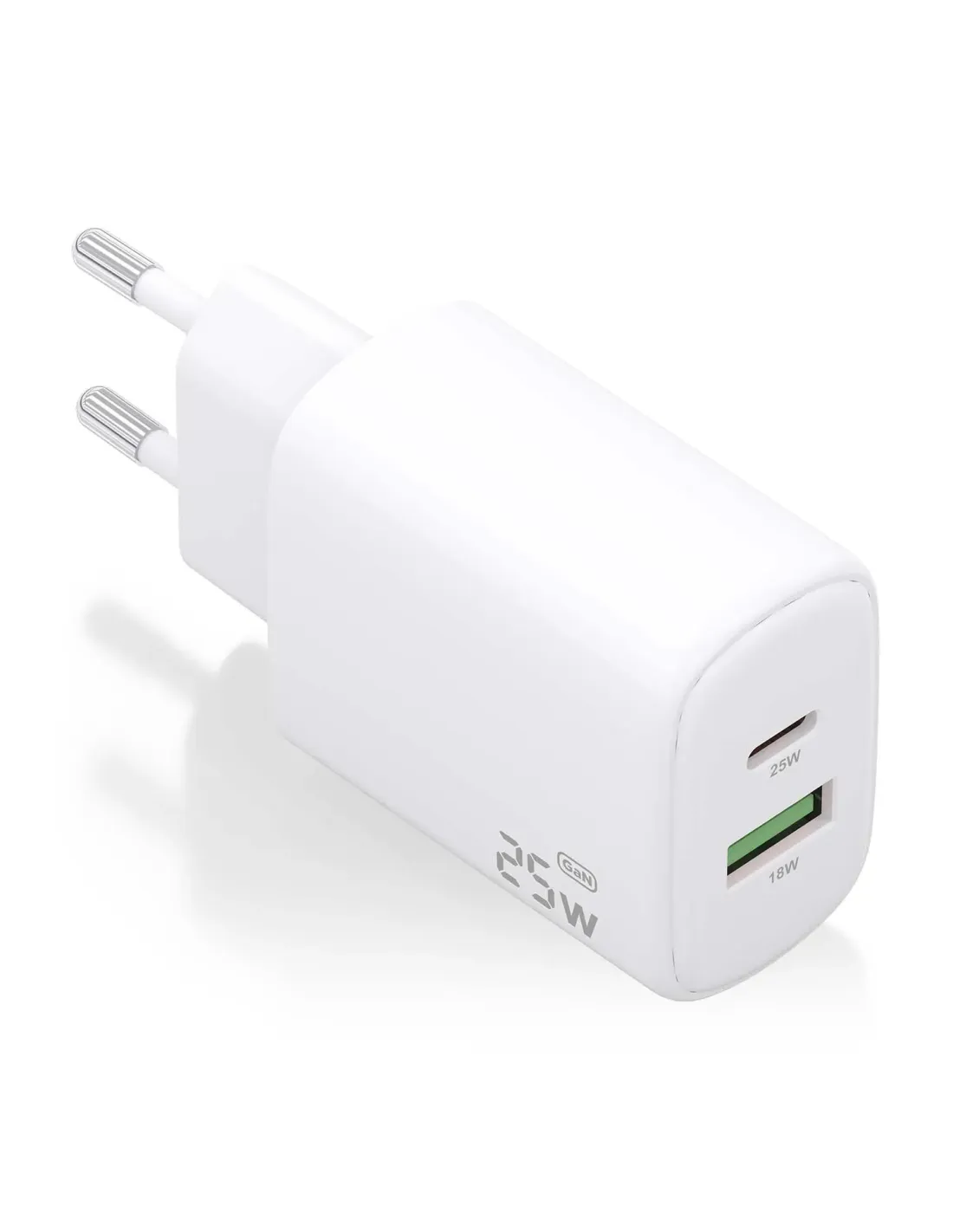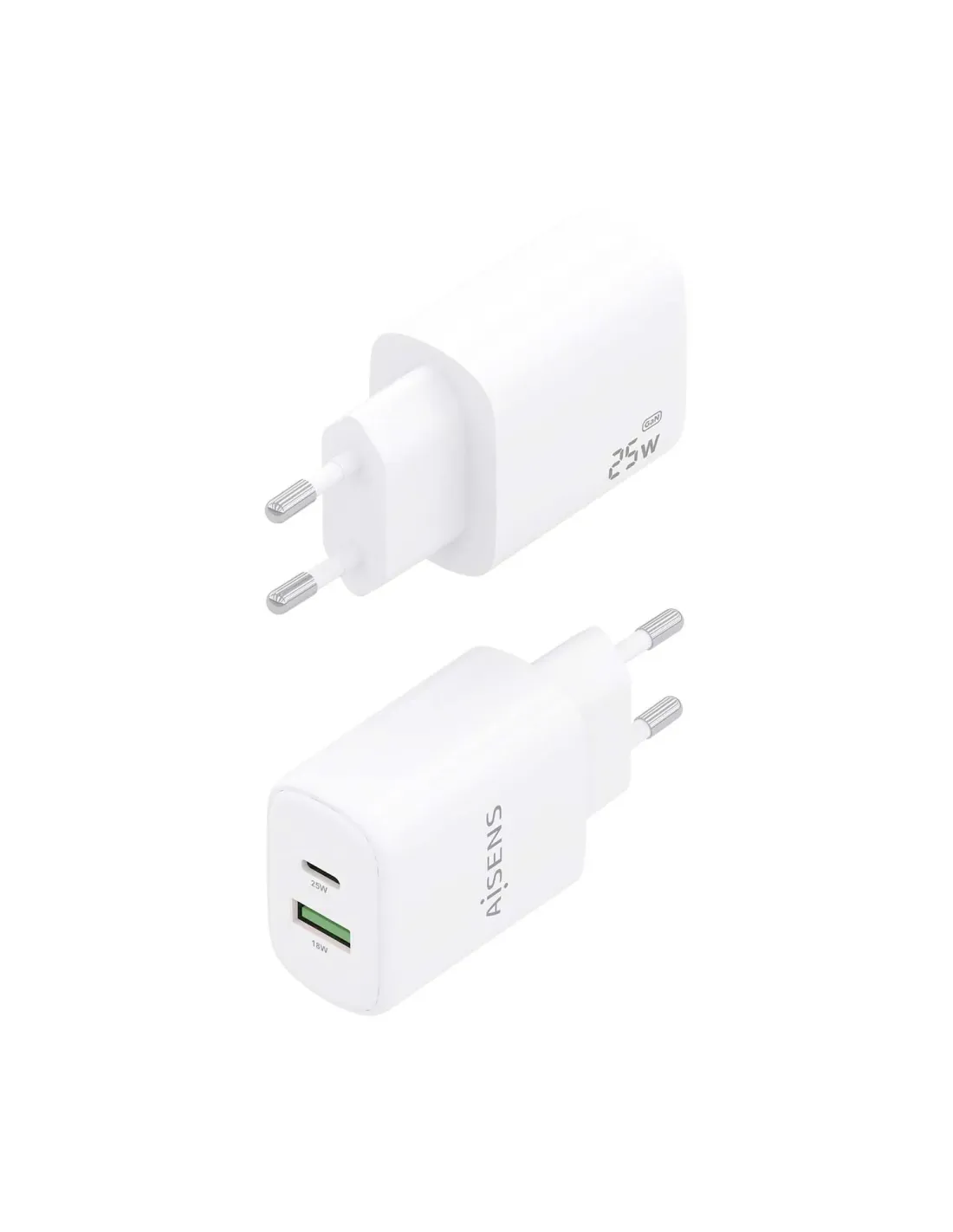 AISENS Cargador GaN 25W, 1xUSB-C PD3.0, 1xUSB-A QC3.0, Blanco, Interior, Corriente alterna, Blanco