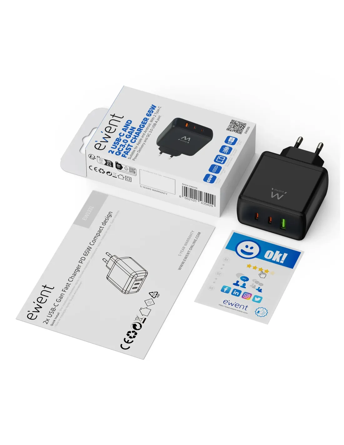 Ewent Cargador rápido GaN de 65W con 3 puertos (2 USB-C PD y 1 USB-A QC), diseño compacto