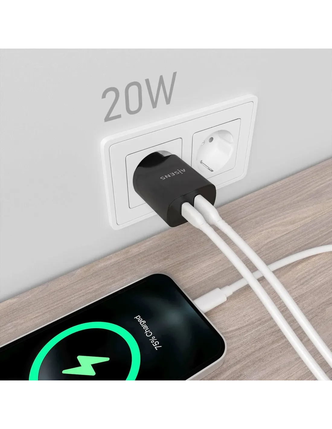 Cargador de Pared Aisens A110-0755/ 1xUSB Tipo-C/ 1xUSB/ 20W