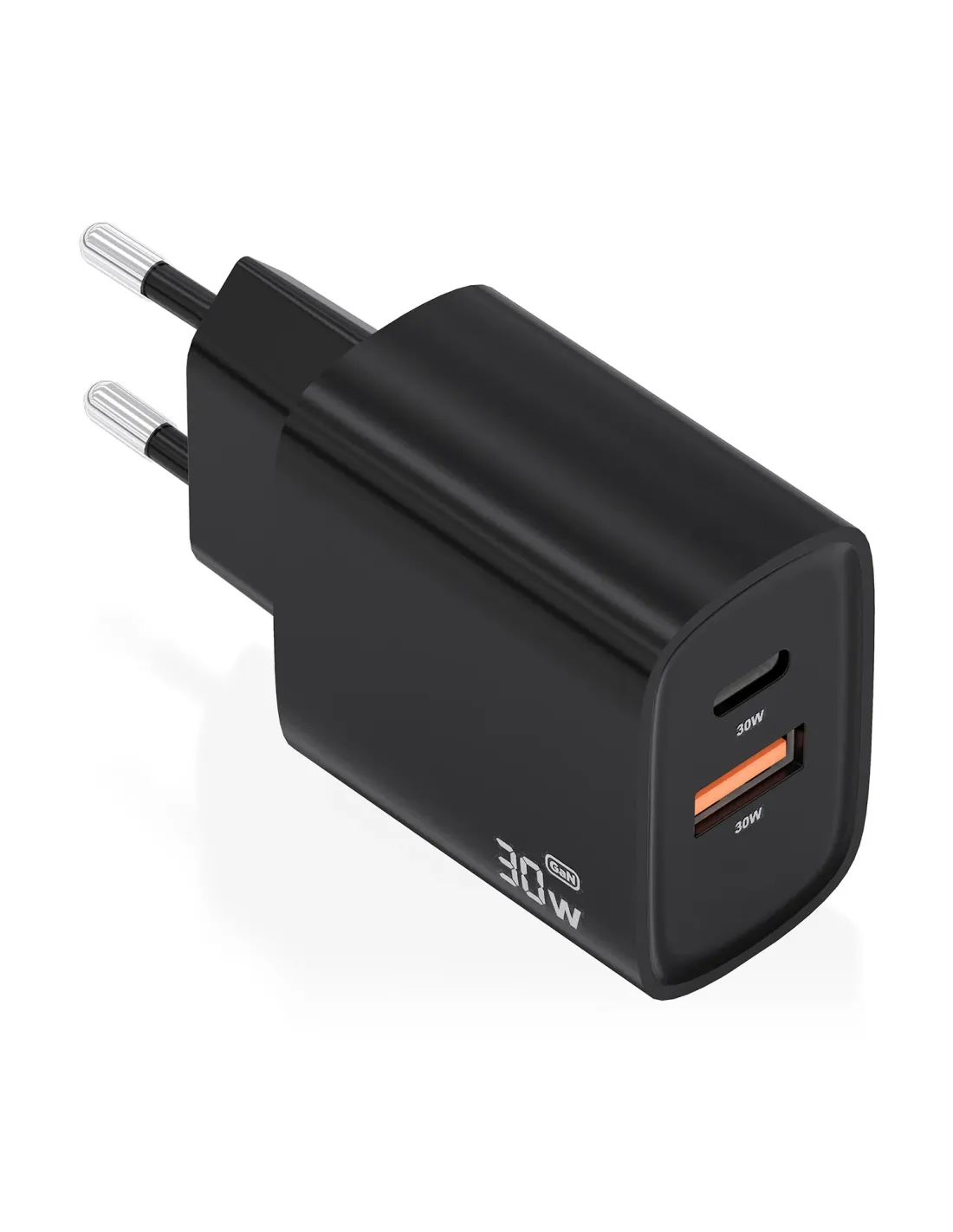 Cargador GaN 30W, 1xUSB-C PD3.0 QC4.0, 1xUSB-A QC3.0, Negro