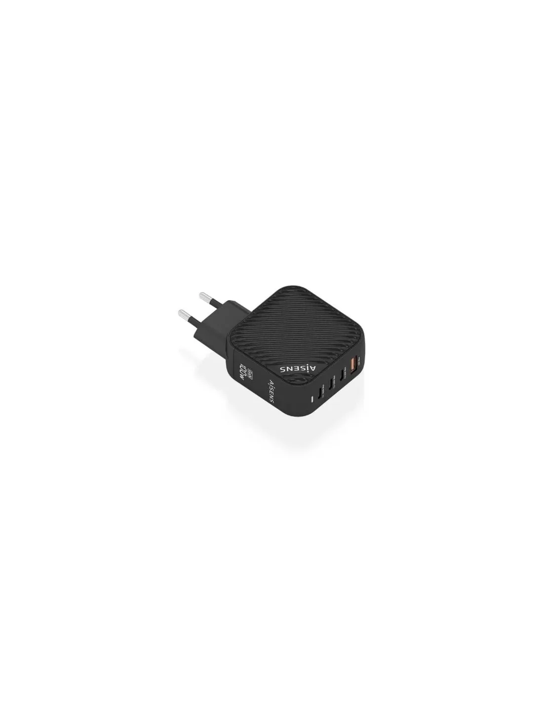 Aisens - Cargador GaN 100W, 3xUSB-C PD3.0 QC4.0, 1xUSB-A QC3.0, NegroCargador GaN USB-C 100W para cargar portátiles, móviles, cámaras y tablets etc. Diseño muy elegante, moderno y práctico.Este cargardor cuenta con la tecnología GaN que ofrece una serie de ventajas, incluyendo una mayor eficiencia energética, menor generación de calor, mayor capacidad de corriente y menor tamaño y peso en comparación con los cargadores tradicionales de silicio. Estas ventajas hacen que los cargadores GaN sean una opción cada vez más popular para usuarios que buscan una carga más rápida, eficiente y sostenible.