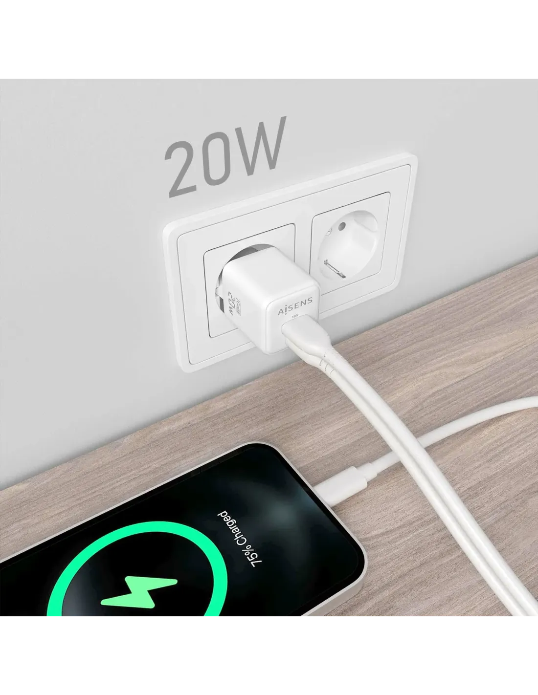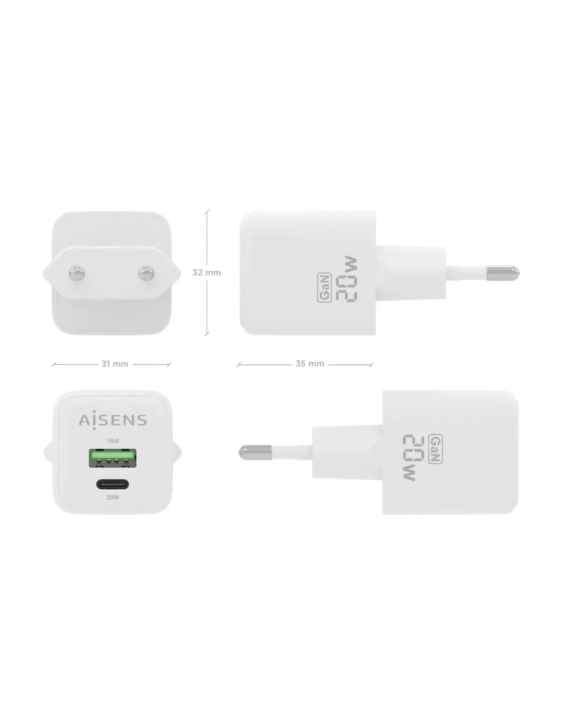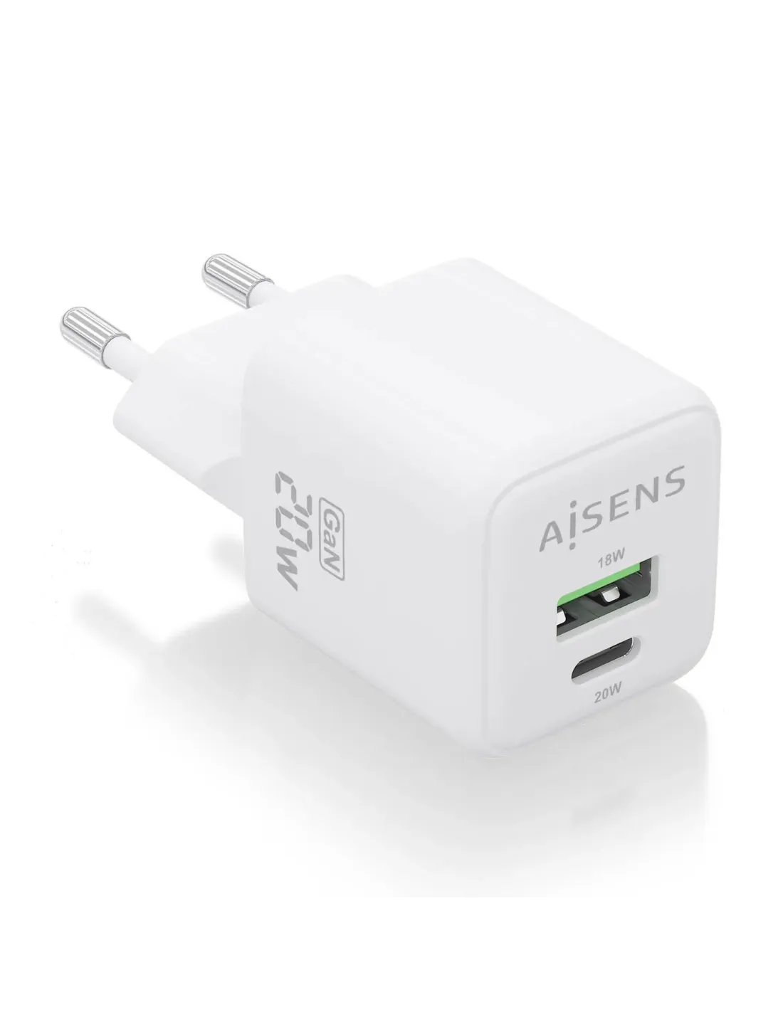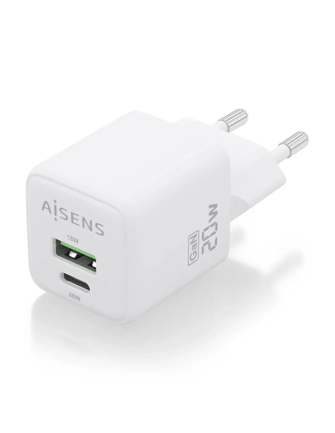 Cargador de Pared GaN Aisens ASCH-20W2P010-W/ 1xUSB Tipo-C/ 1xUSB/ 20W