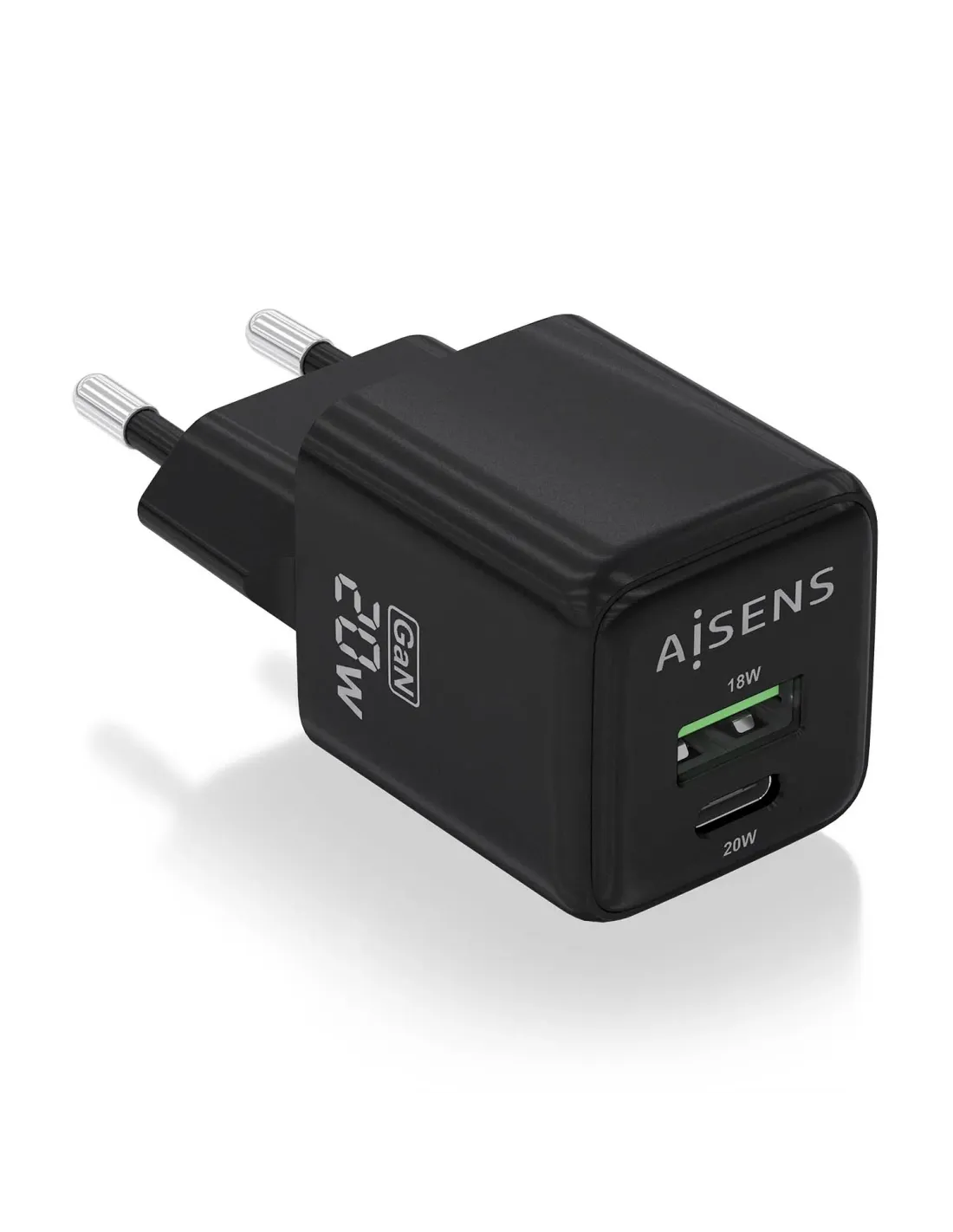Cargador de Pared GaN Aisens ASCH-20W2P011-BK/ 1xUSB Tipo-C/ 1xUSB/ 20W