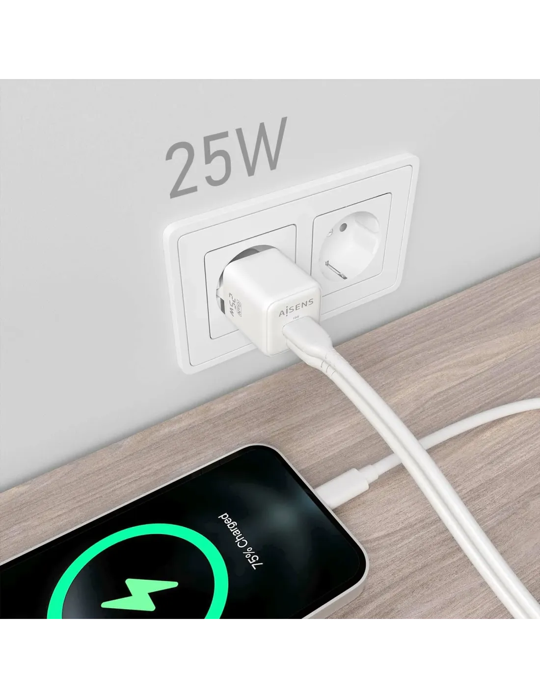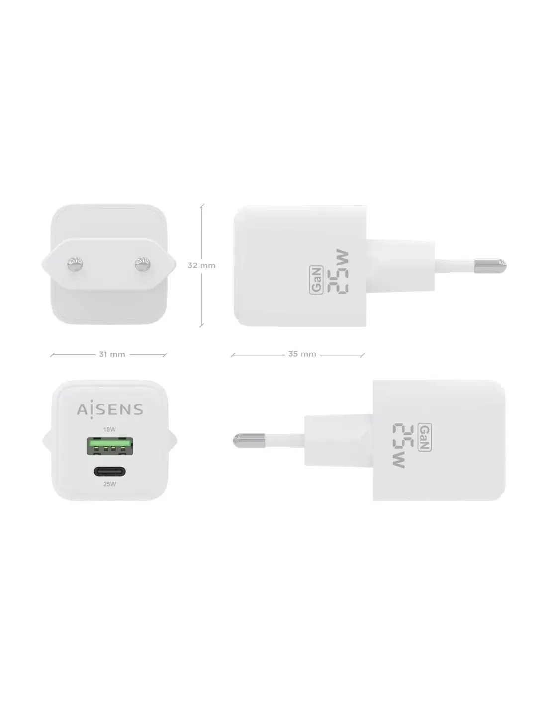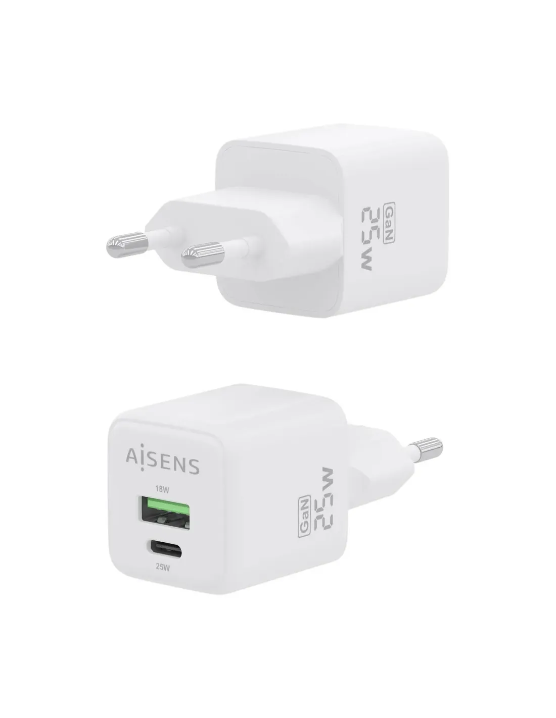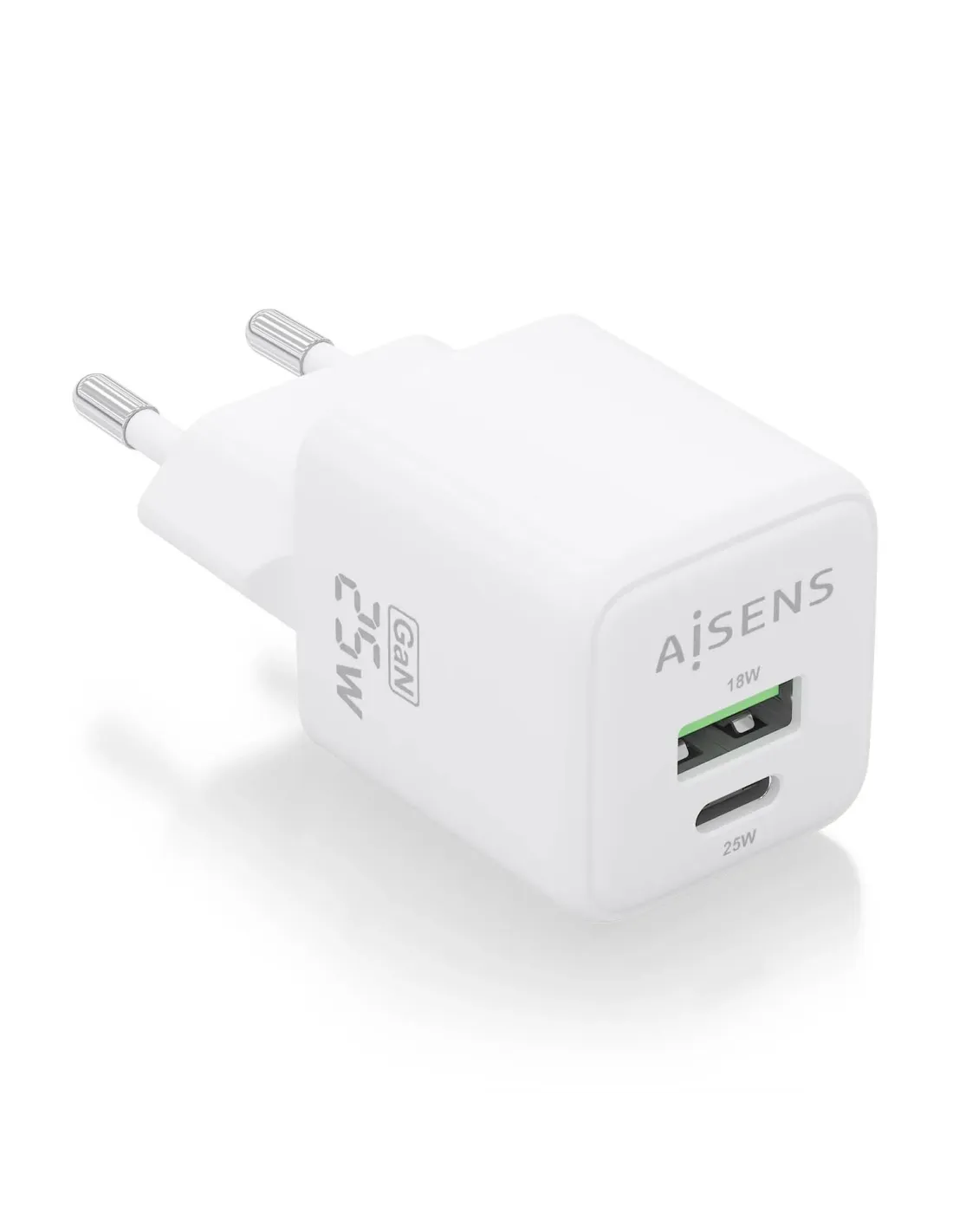 Cargador de Pared GaN Aisens ASCH-25W2P014-W/ 1xUSB Tipo-C/ 1xUSB/ 25W