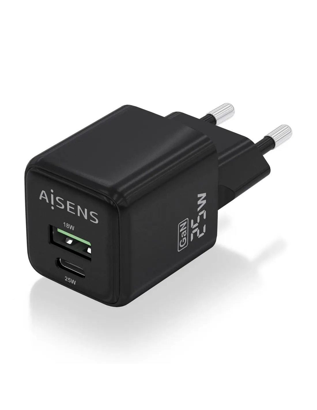 Cargador de Pared GaN Aisens ASCH-25W2P015-BK/ 1xUSB Tipo-C/ 1xUSB/ 25W