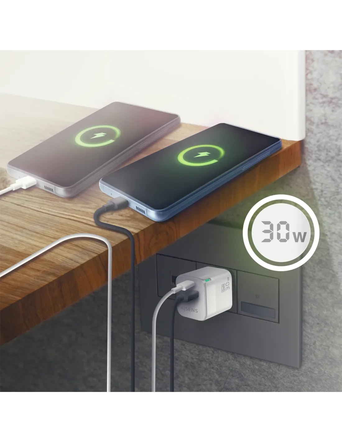 Cargador de Pared GaN Aisens ASCH-30W2P004-W/ 1xUSB Tipo-C/ 1xUSB/ 30W