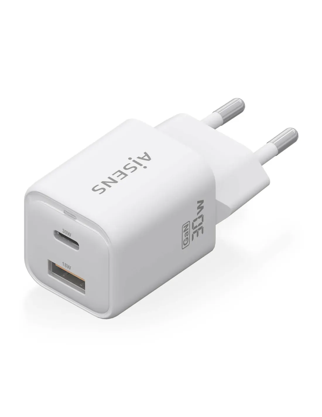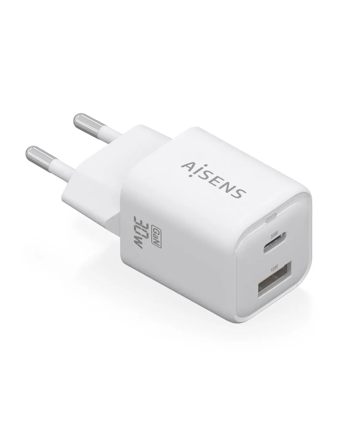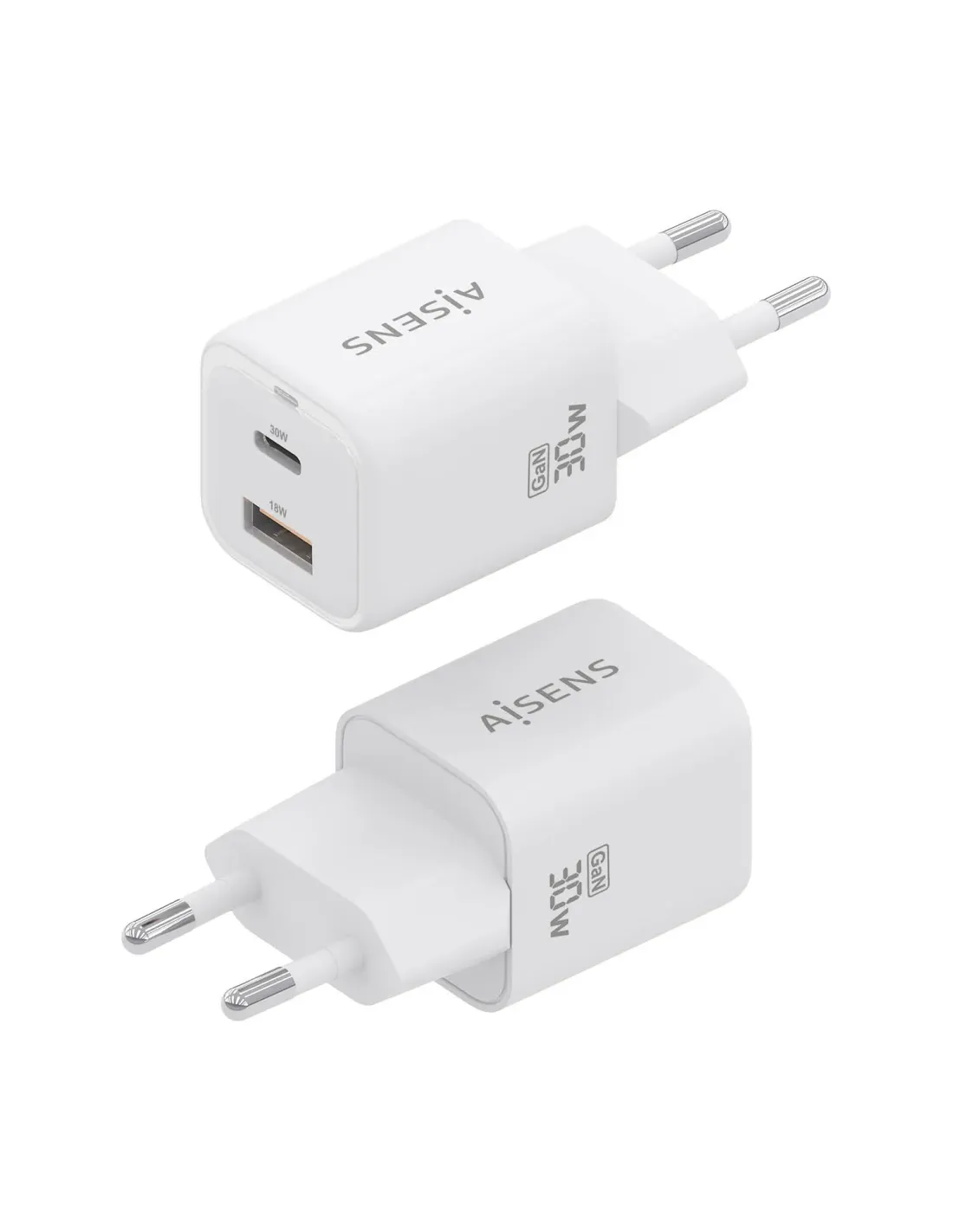 Cargador de Pared GaN Aisens ASCH-30W2P020-W/ 1xUSB Tipo-C/ 1xUSB/ 30W