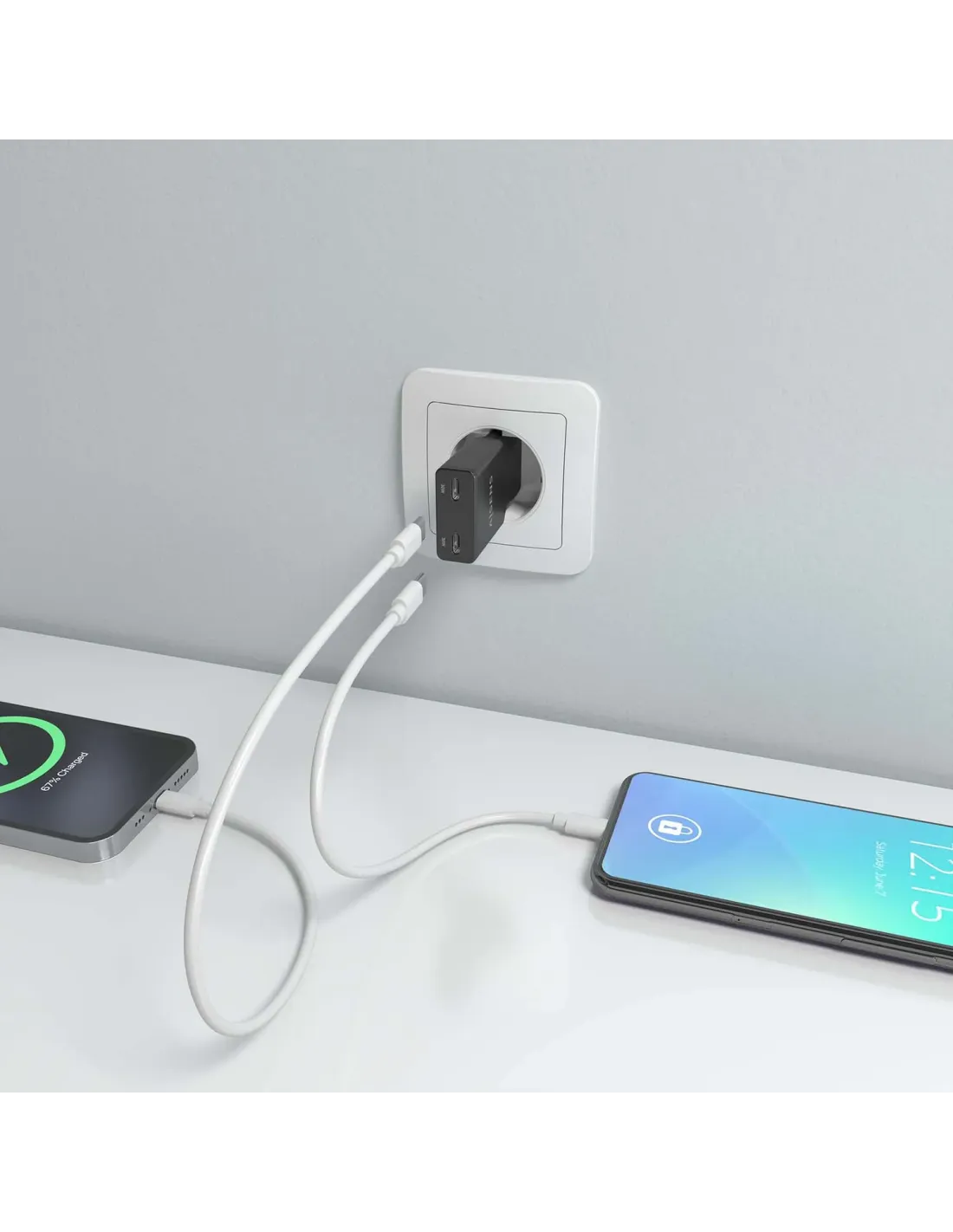 - Cargador GaN USB-C 30W para cargar portátiles, móviles, cámaras y tablets etc. Diseño muy elegante, moderno y práctico.- Este cargador con diseño ultra delgado facilita su transporte durante el viaje, permitiendo guardarlo en el bolsillo del pantalón, en el bolso, en la mochila, en el maletín, etc.- Este cargardor cuenta con la tecnología GaN que ofrece una serie de ventajas, incluyendo una mayor eficiencia energética, menor generación de calor, mayor capacidad de corriente y menor tamaño y peso en comparación con los cargadores tradicionales de silicio. Estas ventajas hacen que los cargadores GaN sean una opción cada vez más popular para usuarios que buscan una carga más rápida, eficiente y sostenible.- Tecnología AI (chip inteligente) incorporado que detecta el tipo de protocolo del dispositivo conectado para maximizar tanto la compatibilidad como la velocidad de carga.- Cargue sus dispositivos USB-C de forma fácil y sencilla.- Múltiples protecciones contra sobrecarga, cortocircuito, lo que garantiza la máxima seguridad para su dispositivo.- Este cargador puede cargar simultáneamente 2 dispositivos USB-C a máxima velocidad.