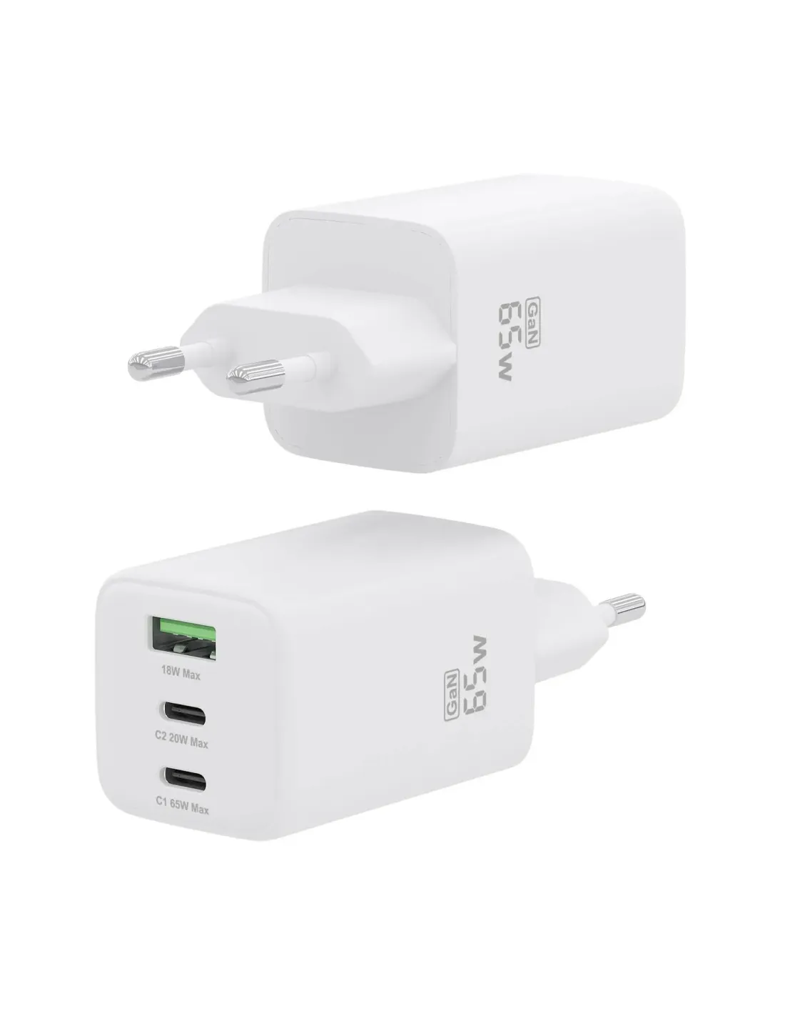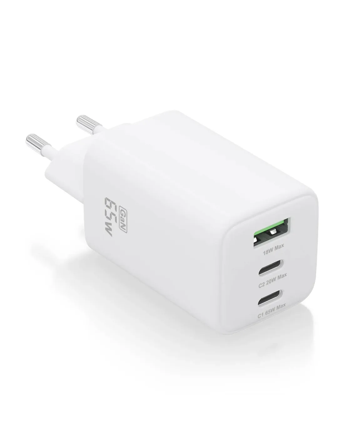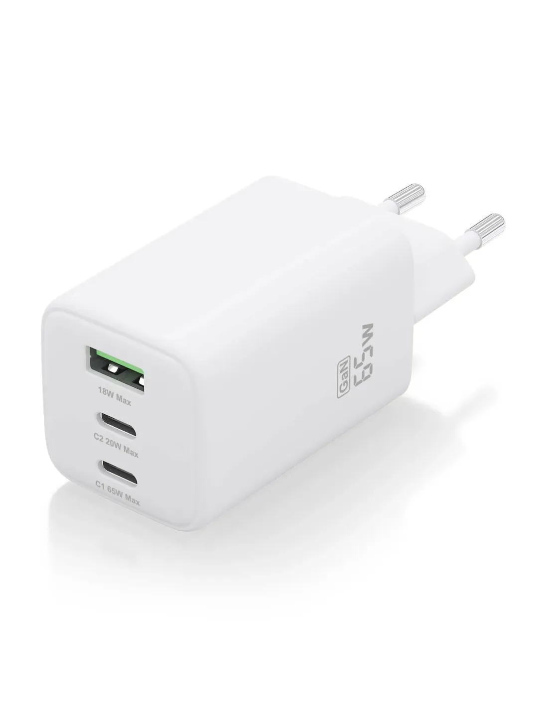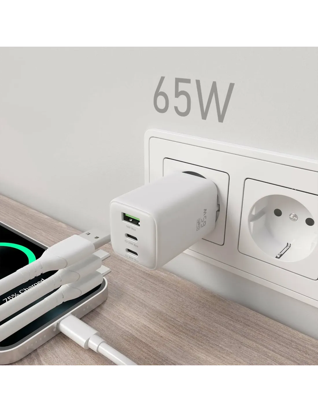 Cargador Gan 65W, 2xUSB-C PD3.0 QC4.0, 1xUSB-A QC3.0, Blanco