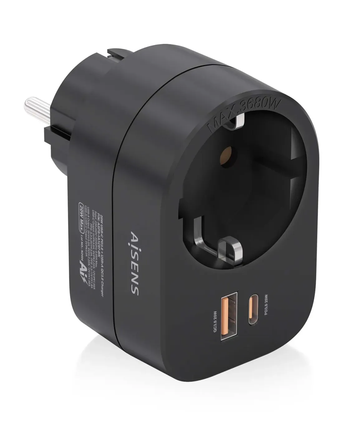 AISENS - Regleta De Pared Multifuncion Con 1 Toma + 1xUSB-C 20W PD3.0, 1xUSB-A 20W QC3.0, NegroRegleta de pared multifunción con 1 toma Schuko, 1 puerto USB-C 20W PD3.0 y 1 puerto USB-A 20W QC3.0