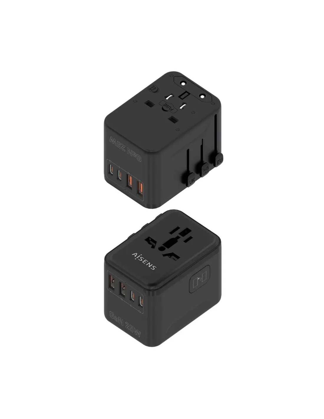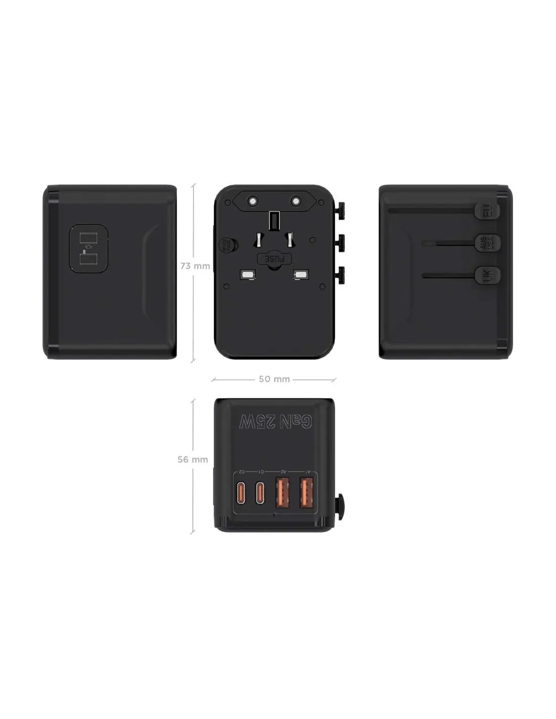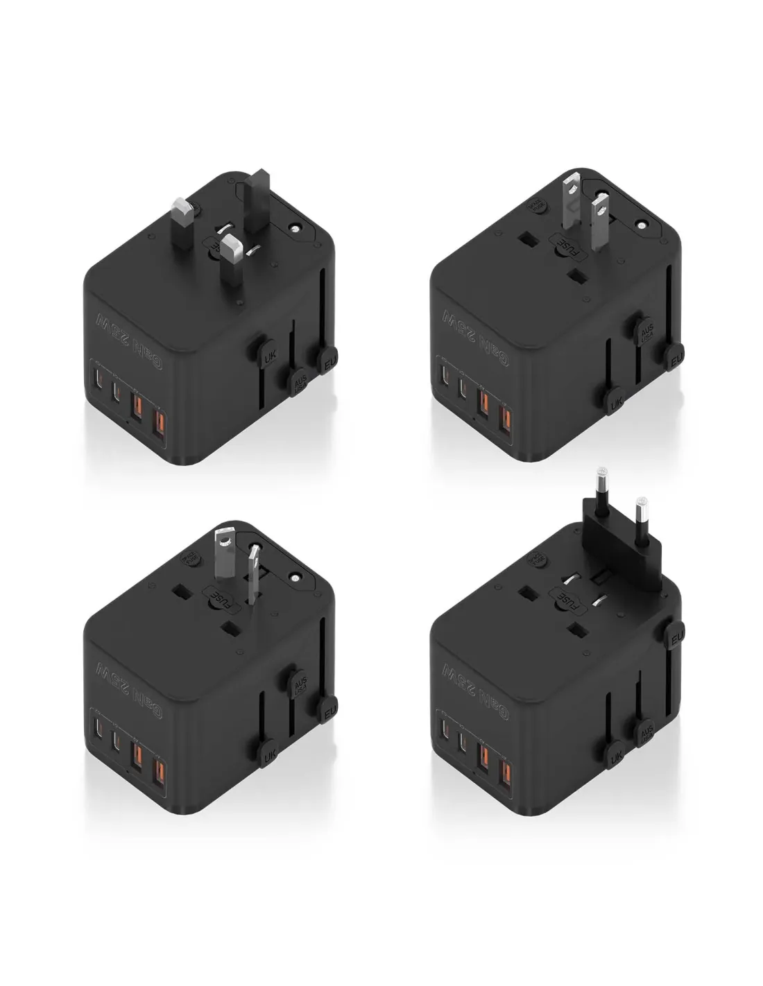 Adaptador Enchufe Universal Para Viaje EU/USA/UK/AU Con Cargador USB GaN, 2xUSB-A QC3.0, 2xUSB-C PD3.0 25W, Negro