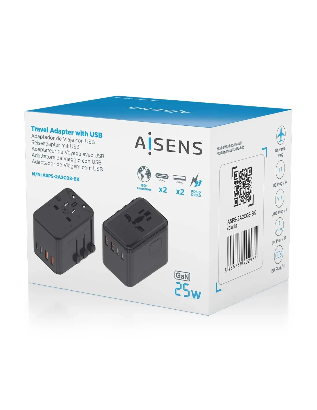 Cargador de Pared Universal GaN para Viaje Aisens ASPS-2A2C08-BK/ Toma de Corriente Universal/ 2xUSB Tipo-C/ 2xUSB/ 25W