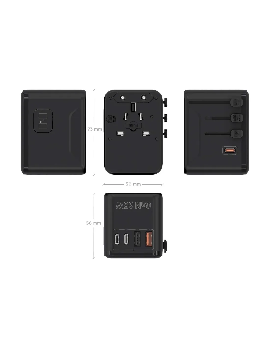 Adaptador Enchufe Universal Para Viaje EU/USA/UK/AU Con Cargador USB GaN, 2xUSB-A (A1 QC3.0), 3xUSB-C (C1 PD3.0) 35W, Negro