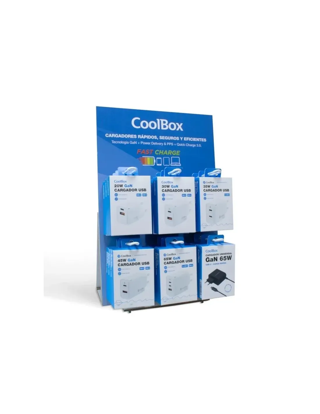 Marca CoolBoX Modelo COO-PACK-GAN2 Características - Pack de 18 cargadores de pared rápidos con tecnología GaN + Expositor CoolBox- Cargador rápido USB de pared - Tecnología GaN para una mayor eficiencia y menor calentamiento - Carga rápida a través de USB-C (PowerDelivery) y USB-A (QuickCharge 3.0) - Indicado para carga de smartphones, tablets, smartwatches, ordenadores… - Protección frente a cortocircuito y sobrecarga Contenido - 3 x cargadores 20W conectores: 1 x USB-A + 1 x USB-C - 3 x cargadores 30W conectores: 1 x USB-A + 1 x USB-C - 3 x cargadores 35W conectores: 2 x USB-C - 3 x cargadores 45W conectores: 1 x USB-A + 1 x USB-C - 3 x cargadores 65W conectores: 1 x USB-A + 2 x USB-C - 3 x cargadores 65W universal con cable USB-C Fecha de revisión 23-02-2026 por IS