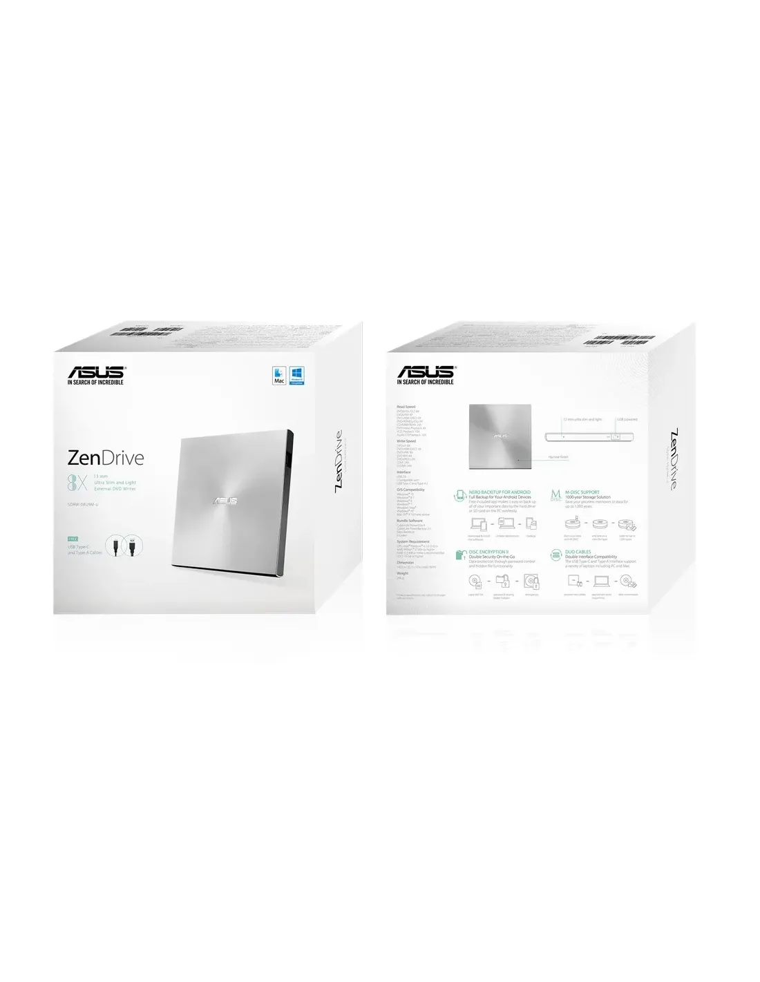 ASUS ZenDrive U9M. Color del producto: Plata, Tipo de carga en disco: Bandeja, Montaje: Horizontal. Utilizar con: Portátil, Tipo de unidad óptica: DVD±RW, Interfaz: USB 2.0. DVD+R, velociad de escritura: 8x, CD-R, velocidad de escritura: 24x, CD-RW, velocidad de escritura: 24x. CD-R, velocidad de lectura: 24x, CD-RW, velocidad de lectura: 24x, CD-ROM, velocidad de lectura: 24x. DVD, tiempo promedio de acceso: 160 ms, Unidad CD-ROM tiempo promedio de acceso: 140 ms