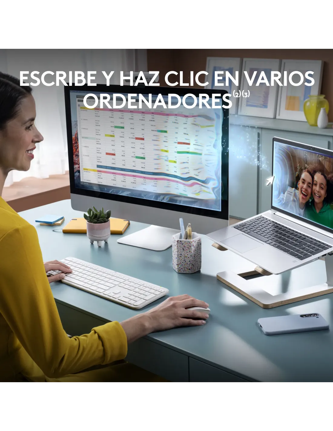 Características del Teclado + Ratón Logitech MK950 Inalámbrico BlancoEl combo inalámbrico Logitech MK950 en color blanco es una solución ideal para quienes buscan comodidad, funcionalidad y diseño elegante en su espacio de trabajo. Diseñado para usuarios que alternan entre varios dispositivos, este pack incluye un teclado de tamaño completo con teclas silenciosas y funciones avanzadas, junto a un ratón ergonómico con desplazamiento inteligente y conectividad fluida. Además, es compatible con Windows, macOS y ChromeOS, lo que lo convierte en una opción versátil y moderna.Conectividad eficiente y multiplataformaGracias a la tecnología Logi Bolt y Bluetooth Low Energy, este pack se conecta de forma estable y segura hasta a tres dispositivos simultáneamente, alternando entre ellos con solo pulsar una tecla Easy-Switch. Tanto el teclado como el ratón son compatibles con la aplicación Logi Options+, que permite personalizar funciones y gestos según tus preferencias.Receptor USB Logi Bolt (incluido) + Bluetooth 5.1Botones Easy-Switch: hasta 3 dispositivosCompatible con Windows, macOS y ChromeOSDiseño cómodo y sostenibleEl teclado de perfil bajo y el ratón ergonómico están diseñados para ofrecer comodidad durante todo el día, con detalles como recubrimientos de goma y teclas silenciosas. Además, ambos dispositivos incorporan materiales reciclados y cuentan con certificación de carbono neutro, reafirmando el compromiso de Logitech con la sostenibilidad.Teclado con 48% de plástico recicladoRatón con 25% de plástico recicladoCertificación de carbono neutro y embalaje FSC?Teclado Signature Slim K950: funcionalidad completaEste teclado de tamaño completo incorpora teclado numérico, indicadores LED y patas ajustables para mayor ergonomía. Sus teclas Easy-Switch permiten cambiar entre dispositivos rápidamente, mientras que el diseño impreso es compatible con varios sistemas operativos.Duración de pilas: hasta 36 meses (2 x AAA incluidas)Indicadores de bloqueo de mayúsculas, carga y Easy-SwitchCompatible con tecnología Logitech FlowRatón Signature M750: precisión silenciosaEquipado con la tecnología SmartWheel, este ratón ofrece desplazamiento fluido y silencioso. Su diseño contorneado mejora el agarre, y el sensor óptico avanzado permite ajustar el DPI entre 400 y 4000, ideal para distintas tareas.6 botones funcionales + rueda de desplazamientoDuración de pila: hasta 24 meses (1 x AA incluida)Indicadores LED de carga y Easy-SwitchAutonomía y rendimiento inalámbricoDisfruta de una experiencia inalámbrica sin interrupciones gracias a su alcance de hasta 10 metros, y una autonomía de batería que garantiza meses de uso sin reemplazo. Ideal para escritorios despejados y trabajo en movilidad.Alcance inalámbrico: hasta 10 metrosRequiere conexión a Internet para configurar Logi Options+Encendido/apagado manual para ahorrar energíaOtras especificacionesDimensiones del teclado: 433,8 x 134,8 x 23,1 mm / 685 g con bateríaDimensiones del ratón: 108,2 x 61 x 38,8 mm / 101,3 g con bateríaDPI del ratón: de 400 a 4000 (ajustable en pasos de 100 DPI)