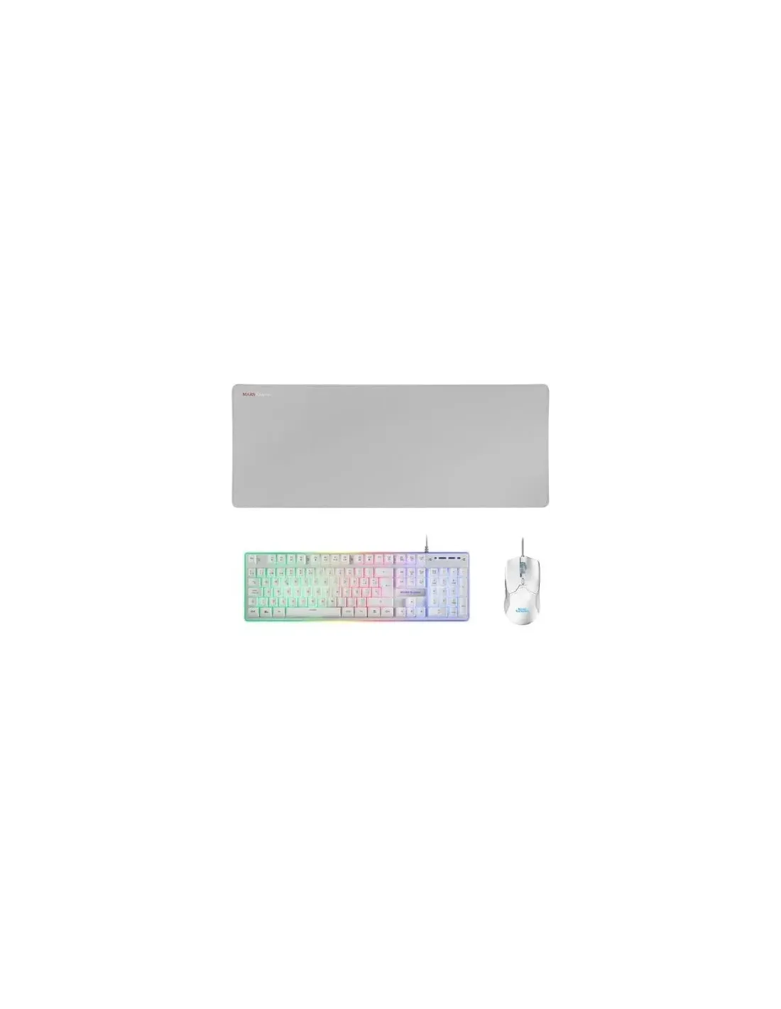 Especificaciones Mars Gaming Combo MCPX GAMING 3IN1 RGB BLANCOPack Premium con 3 de nuestros mejores periféricos: Teclado híbridoH-MECH, ratón ultra ligero 10K con software de control y una alfombrilla XXL.Marca Mars GamingModelo MCPXWESCaracterísticas Teclado- Interfaz del dispositivo: USB- Interruptor del teclado: Interruptor de membrana- Idioma del teclado: Español- Dispositivo apuntador:- Formato del teclado: Estándar- Teclado numérico- Retroiluminación- Tipo de retroiluminación: LED RGB- Estilo de teclado: Derecho- Diseño de plancha ergonómico- Color del producto: Blanco- Material: Acrilonitrilo butadieno estireno (ABS), Aluminio- Longitud de cable: 1.5 m- Antighosting- Control de energía- Alimentación: USB- Dimensiones de teclado (Ancho x Profundidad x Altura): 439 x 135 x 37 mm- Peso del teclado: 692 gRatón- Ratón incluido- Factor de forma: mano derecha- Tecnología de detección de movimientos: Óptico- Resolución de movimiento: 10000 DPI- Cantidad de botones: 6- Tipo de botones: Botones presionados- Rueda de desplazamiento- Tipo de desplazamiento: Rueda- Direcciones de desplazamiento: Vertical- Longitud del cable del ratón: 1.5 m- Iluminación de color: Rojo/Verde/Azul- Requisitos del sistema- Sistema operativo Windows soportado- Sistema operativo MAC soportado- Sistema operativo Linux soportado- Dimensiones del ratón (Ancho x Profundidad x Altura): 130 x 68 x 38 mm- Peso del ratón: 69 gAlfombrilla- Alfombrilla de ratón incluida- Tamaño de la alfombrilla de ratón: 800 x 300 mm- Grosor de la alfombrilla para ratón: 4 mm- Peso de la alfombrilla para ratón: 452 g- Material de la alfombrilla para ratón: Tela, Caucho- Número de productos incluidos: 3 pieza(s)