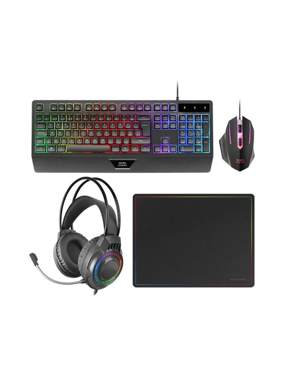 Características del Teclado, Ratón, Auriculares y Alfombrilla Mars Gaming MCP124PRO RGB 3200DPI Negro PortuguésEl Mars Gaming MCP124PRO es un completo combo gaming 4 en 1 diseñado para jugadores que buscan rendimiento, comodidad y un setup visualmente atractivo desde el primer momento. Este pack incluye teclado H-Mech con iluminación RGB y reposamuñecas, ratón gaming de alta precisión, auriculares con sonido envolvente y alfombrilla nanotextil, proporcionando todo lo necesario para disfrutar de una experiencia de juego inmersiva y equilibrada. Su compatibilidad multiplataforma lo convierte en una opción versátil para jugar tanto en PC como en consolas.Combo gaming completo para tu setupEste pack integra cuatro periféricos esenciales para gaming, pensados para trabajar juntos y ofrecer una experiencia coherente en rendimiento y diseño. Con iluminación RGB y FRGB en varios componentes, el conjunto aporta un estilo moderno y llamativo a cualquier espacio de juego.Pack gaming 4 en 1: teclado, ratón, auriculares y alfombrillaDiseño en color negro con iluminación RGB y FRGBIdeal para setups gaming completos desde el primer momentoTeclado H-Mech con reposamuñecas y RGBEl teclado incluido utiliza tecnología H-Mech, que combina la durabilidad de los teclados de membrana con una respuesta más rápida y precisa inspirada en los teclados mecánicos. Su diseño ergonómico con reposamuñecas integrado ayuda a reducir la fatiga durante largas sesiones de juego.Formato completo (100%) con teclado numéricoTecnología Mars Gaming H-Mechanical RedIluminación LED RGB multicolorDistribución QWERTY en portuguésVida útil de hasta 20 millones de pulsacionesRatón gaming RGB de alta precisiónEl ratón gaming incluido está equipado con un sensor óptico ajustable hasta 3200 DPI que ofrece control preciso y respuesta rápida durante las partidas. Su diseño ergonómico para mano derecha y los switches HUANO garantizan comodidad y durabilidad incluso en sesiones intensivas.Resolución de hasta 3200 DPISensor óptico de alta precisión4 botones con rueda de desplazamientoIluminación RGB RainbowDiseño ergonómico para mano derechaAuriculares gaming con sonido envolventeLos auriculares del pack ofrecen audio nítido y graves potentes para disfrutar de juegos, música o contenido multimedia. Su diseño circumaural con diadema flotante ajustable proporciona mayor comodidad, mientras que el micrófono flexible tipo boom permite comunicación clara durante las partidas online.Respuesta de frecuencia: 20 ? 20000 HzMicrófono flexible con rango de 100 ? 10000 HzImpedancia: 32 ?Iluminación FRGB RainbowControl de volumen integradoAlfombrilla nanotextil de gran precisiónLa alfombrilla incluida está fabricada con superficie nanotextil y base de caucho natural, lo que proporciona un deslizamiento suave y preciso junto con una excelente estabilidad gracias a su base antideslizante. Su tamaño amplio permite realizar movimientos amplios con total control.Tamaño: 360 x 260 mmGrosor: 3 mmSuperficie nanotextil de alta precisiónBase de caucho natural antideslizanteCompatibilidad multiplataformaEl combo MCP124PRO está diseñado para ofrecer compatibilidad con múltiples dispositivos y plataformas, permitiendo disfrutar de tus periféricos gaming tanto en ordenador como en consolas.Compatible con PC, Mac y LinuxCompatible con PS4, PS5, Xbox One, Xbox Series X|S y Nintendo SwitchConexión USB tipo AInstalación sencilla plug & playOtras especificacionesConectividad: AlámbricaLongitud del cable del teclado: 1,45 mLongitud del cable del ratón: 1,45 mLongitud del cable de los auriculares: 1,8 mMaterial del teclado: ABSDimensiones del teclado: 450 x 181 x 36 mmPeso del teclado: 660 gDimensiones del ratón: 133 x 85 x 42 mmPeso del ratón: 83 gDimensiones de los auriculares: 190 x 240 x 100 mmPeso de los auriculares: 251 gContenido del paquete: 4 piezas