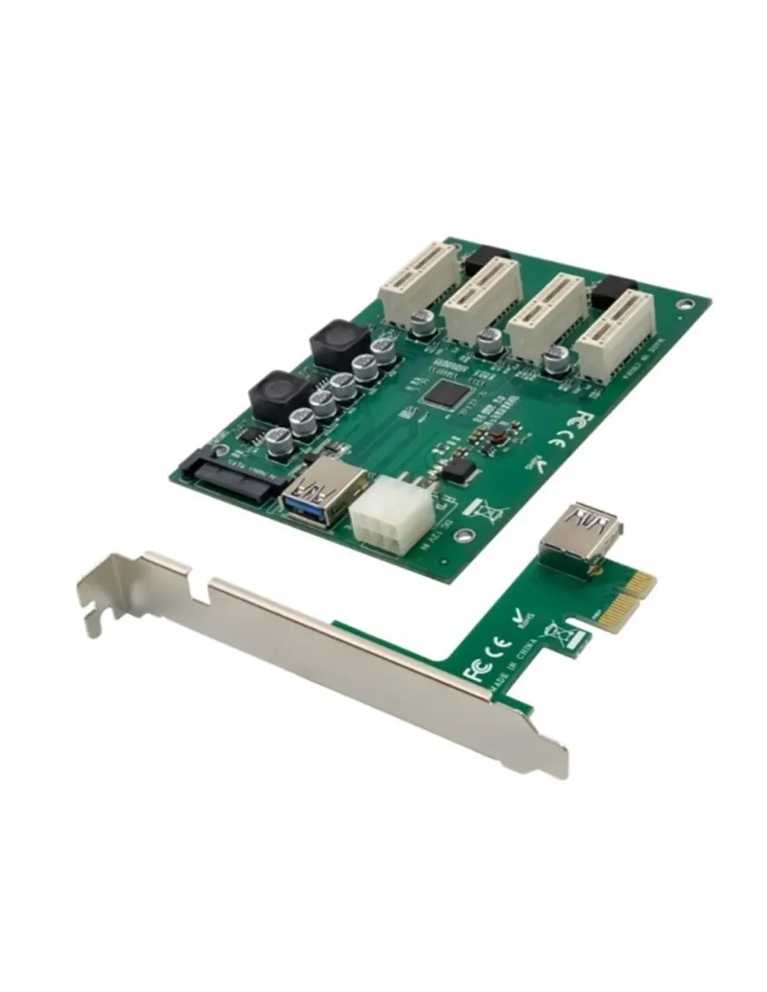 Amplíe una sola ranura PCIe x1 en cuatro ranuras PCIe x1 en la placa base o el sistema integrado de una PCMúltiples interfaces de entrada de energía: conector de alimentación de 6 pines, conector SATA de 15 pinesInstalación sencilla Plug and PlayGeneralColor: VerdeEAN: 4015867228050Número de modelo: EMRICK10GEspecificaciones físicasPeso del producto (kg): 0,092Dimensiones (Ancho x Fondo x Alto): 120x83x20mmEspecificaciones del SistemaConfiguración del puerto: Ranura PCIe x1 x 4versión PCI: PCIe 2.0Conector: PCIe x1