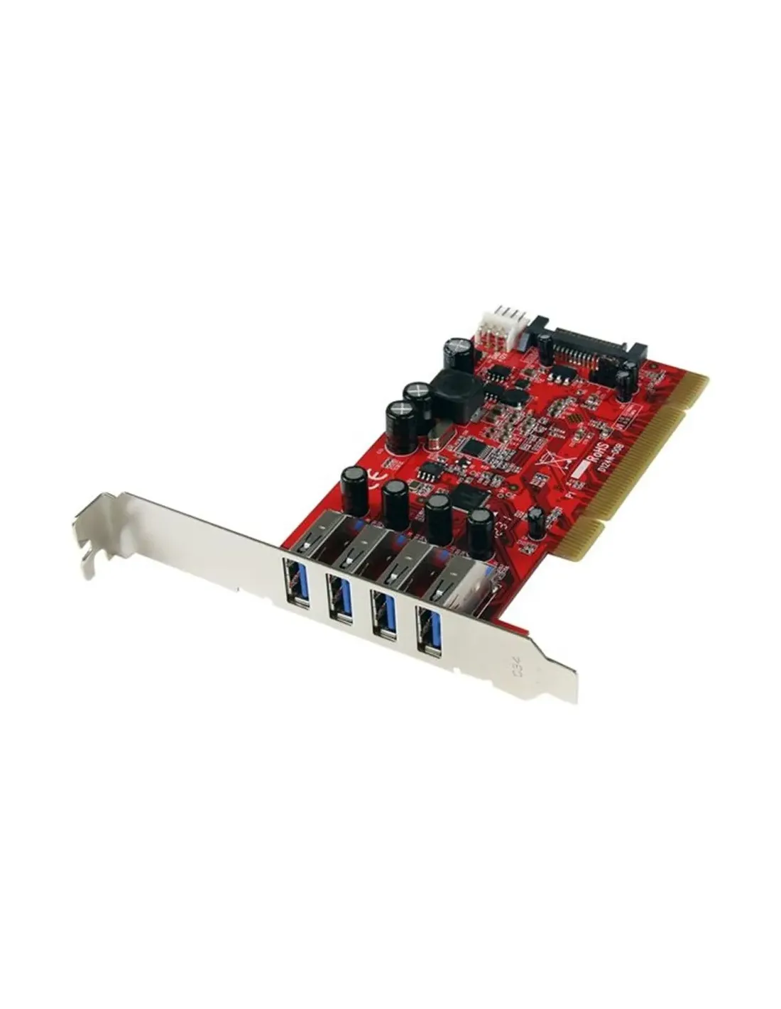 Características de la StarTech.com Tarjeta Adaptador PCI USB 3.0 SuperSpeed 4 Puertos con Alimentación SATA LP4La tarjeta adaptadora **StarTech.com PCI USB 3.0 SuperSpeed de 4 puertos** está diseñada para ofrecer una forma rápida y fiable de actualizar cualquier equipo de sobremesa con conectividad USB 3.0. Ideal para usuarios que necesitan transferencias de datos de alta velocidad, es perfecta para estaciones de trabajo, servidores o PCs que requieren **mayor rendimiento y compatibilidad** con periféricos modernos. Su diseño de perfil bajo la hace ideal para carcasas compactas, sin sacrificar capacidad ni potencia.Expansión de puertos USB 3.0 con alta velocidadGracias a sus **4 puertos USB 3.0 Tipo A** compatibles con velocidades de hasta **5 Gbps**, esta tarjeta permite conectar múltiples dispositivos como discos duros externos, memorias USB o periféricos profesionales sin cuellos de botella. Además, es compatible con versiones anteriores USB 2.0 y 1.1, asegurando una transición fluida con dispositivos existentes.4 puertos USB 3.0 SuperSpeed Tipo A (9 clavijas)Velocidad de transferencia de hasta 5 GbpsCompatible con USB 1.1, 2.0 y 3.0Diseño de perfil bajo y alimentación externaIncluye un soporte de bajo perfil, ideal para equipos compactos o de formato reducido. Su alimentación adicional mediante conector SATA LP4 garantiza un rendimiento estable incluso al usar periféricos de alto consumo. Esto permite una conectividad constante y segura en entornos de trabajo exigentes.Incluye bracket de perfil bajoAlimentación externa vía conector SATA LP4Compatible con ranuras PCI-X (3,3 V y 5,0 V)Compatibilidad amplia con sistemas y dispositivosCompatible con una gran variedad de sistemas operativos Windows, esta tarjeta se instala fácilmente gracias a los controladores incluidos. Además, ha sido diseñada para trabajar con otros productos StarTech.com, garantizando la integración sin complicaciones en configuraciones ya existentes.Compatible con Windows XP, Vista, 7, 8, 10 y Windows ServerIncluye CD con controladores y utilidadesDiseñada para: HBS304A24A, S3510BMU33, UNI251BMU33, entre otrosConstrucción sólida y garantía de calidadCon un acabado en color rojo y fabricación robusta, esta tarjeta cumple con normativas **FCC y RoHS**, lo que asegura su uso en entornos profesionales. Su procesador NEC uPD720202 garantiza eficiencia y fiabilidad.Procesador: NEC uPD720202Cumple normativas FCC y RoHSDimensiones: 13,3 cm x 2 cm x 6,5 cm | Peso: 80 gOtras especificacionesTemperatura de funcionamiento: de 5 °C a 50 °CHumedad de funcionamiento: 15% - 90%Tecnología de conectividad: cableada