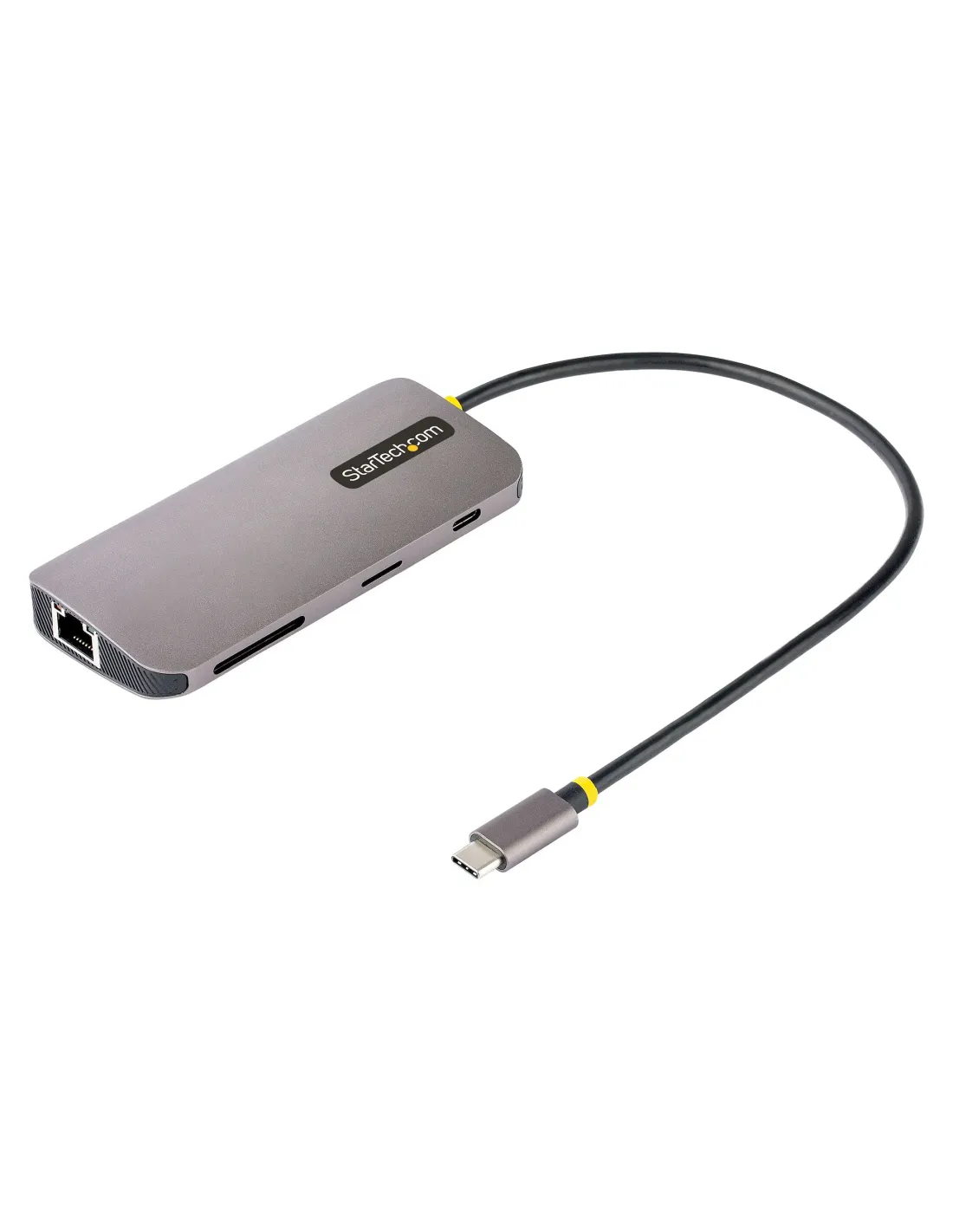 Características del StarTech.com Adaptador Multipuertos USB-C 115B-USBC-MULTIPORTEl StarTech.com 115B-USBC-MULTIPORT es un adaptador multipuerto compacto y potente, ideal para usuarios que necesitan conectividad versátil en un solo dispositivo. Diseñado para profesionales en movilidad, estudiantes o entornos corporativos, este adaptador transforma un solo puerto USB-C en un centro de conexiones completo con salida de vídeo 4K, carga PD de 100 W, red Ethernet, lector de tarjetas SD/microSD y 3 puertos USB-A. Compatible con una amplia gama de sistemas operativos, es una solución plug-and-play que mejora la productividad sin complicaciones.Conectividad máxima en un formato compactoCon un diseño ultracompacto y peso de solo 75 g, este hub USB-C es perfecto para llevar en cualquier bolsa o mochila sin ocupar espacio. A pesar de su tamaño, ofrece todas las conexiones esenciales para el día a día en el trabajo o estudio.3 puertos USB-A 3.2 Gen 1 (5 Gbps)1 puerto HDMI compatible con resolución 4K a 60 Hz1 puerto Ethernet RJ-45 Gigabit (10/100/1000 Mbps)Lector de tarjetas SD y microSDPuerto USB-C con entrega de energía de hasta 100 WResolución 4K y soporte HDR10Con salida HDMI 2.0, este adaptador permite conectar una pantalla externa con resolución hasta 4096 x 2160 a 60 Hz, ideal para tareas de diseño, presentaciones o simplemente para ampliar tu espacio de trabajo. Además, soporta HDR10 y DisplayPort Alt Mode para una calidad visual superior.Salida HDMI tipo A de 19 pinesCompatible con DisplayPort 1.4 y HDR10Perfecto para monitores, proyectores o televisoresEntrega de energía y eficiencia de cargaGracias a su tecnología de USB Power Delivery 3.0, el adaptador puede alimentar tu portátil con hasta 100 W de potencia, mientras mantiene activos todos los periféricos conectados. Es ideal para estaciones de trabajo donde se prioriza la eficiencia y el orden.USB-C con suministro de energía de 100 WProtocolo de transferencia UASP para mejor rendimientoCompatible con cargadores PD de alta potenciaCompatibilidad multiplataforma y facilidad de usoEste modelo funciona sin necesidad de drivers gracias a su compatibilidad con los principales sistemas operativos. Es una solución "plug and play" pensada para integrarse de forma rápida en cualquier entorno profesional, educativo o doméstico.Compatible con Windows 7 a 11, macOS (10.11 hasta Ventura 13), Linux 3.5.x+, Android, iPadOS y Chrome OSCertificaciones: Plug and Play, FCC, RoHS, WEEEIncluye cable USB-C integrado de 30 cmDiseño robusto y garantía StarTech.comConstruido en un elegante acabado gris espacial, el adaptador ofrece una apariencia profesional y duradera. Con una garantía limitada de 3 años, es una inversión confiable para quienes exigen rendimiento y soporte a largo plazo.Dimensiones: 11,2 cm x 5 cm x 1,2 cmPeso: 75 g (200 g con embalaje)Garantía limitada de 3 añosOtras especificacionesProtocolo de red: Ethernet, Fast Ethernet, Gigabit EthernetEstándares: IEEE 802.3, 802.3u, 802.3abRango de temperatura de funcionamiento: 0 °C a 70 °C