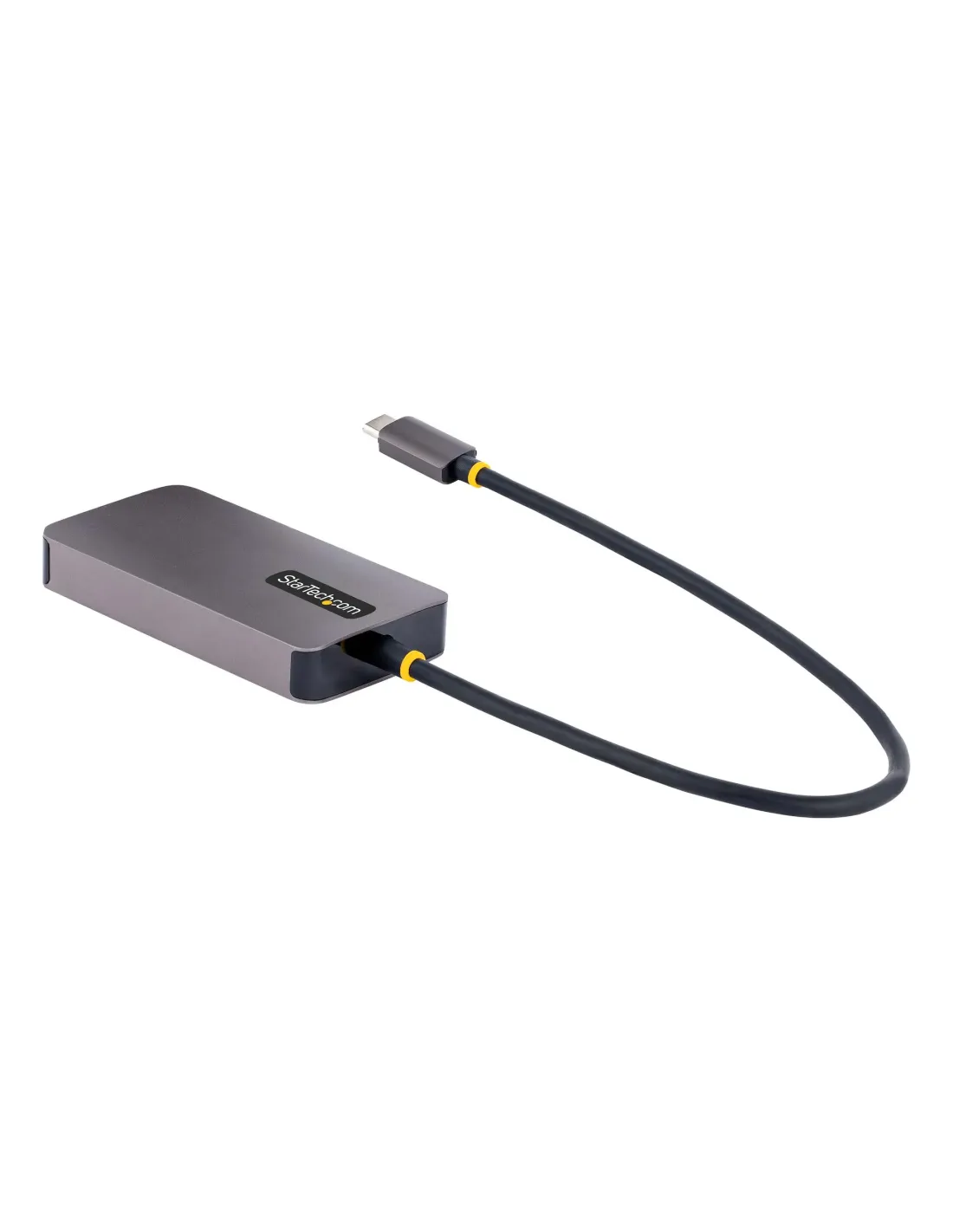Características del Adaptador StarTech.com USB-C a HDMI, DVI y VGAEl **adaptador de vídeo multipuerto USB-C de StarTech.com** está diseñado para ofrecer una solución compacta y versátil para conectar tu portátil USB-C o Thunderbolt 3/4 a diferentes tipos de pantallas. Ideal para profesionales en movimiento o estaciones de trabajo mixtas, este adaptador te permite conectarte a **monitores HDMI, DVI o VGA** sin necesidad de drivers ni configuraciones complicadas.Compatibilidad universal con calidad 4KGracias al soporte de **DisplayPort Alt Mode**, este adaptador es totalmente compatible con dispositivos USB-C y Thunderbolt 3/4, incluyendo portátiles Windows, MacBooks y Chromebooks. Su salida HDMI permite una resolución de hasta **4K a 60 Hz**, ideal para presentaciones de alta definición, edición de contenido o entornos corporativos.Salida HDMI: hasta 3840 x 2160 píxeles a 60 HzSalida DVI: hasta 1920 x 1200 a 60 HzSalida VGA: hasta 1920 x 1200 a 60 HzDiseño compacto y materiales de calidadConstruido en una carcasa de aluminio de color gris, este adaptador es **ligero y resistente**, ideal para transportarlo junto a tu portátil. Su cable USB-C integrado de 30 cm ofrece flexibilidad al conectar dispositivos en escritorios reducidos o configuraciones portátiles.Dimensiones: 8.5 x 4.5 x 1.4 cmPeso: 73 g (137 g con embalaje)Diseño Plug and Play, sin necesidad de driversConectividad versátil en cualquier entornoEste adaptador permite conectar tu dispositivo USB-C a cualquier proyector o monitor que utilice HDMI, DVI o VGA, lo que lo convierte en una herramienta ideal para salas de reuniones, aulas o viajes de negocios.1 x HDMI (Tipo A, 19 pines)1 x DVI (dual link, 24+5 espigas)1 x VGA (HD-15)Diseñado para durarStarTech.com ofrece una **garantía limitada de 3 años**, lo que garantiza un uso prolongado y fiable. Cumple con las principales normativas internacionales para garantizar un funcionamiento seguro y sostenible.Compatible con HDR y HDCP 2.2Certificaciones: RoHS, Thunderbolt 3/4, Plug and PlayRango de temperatura de funcionamiento: de 0 °C a 45 °COtras especificacionesCable USB-C integrado de 30 cmAltura de embalaje: 3 cmAnchura de embalaje: 17 cmProfundidad de embalaje: 14.2 cm