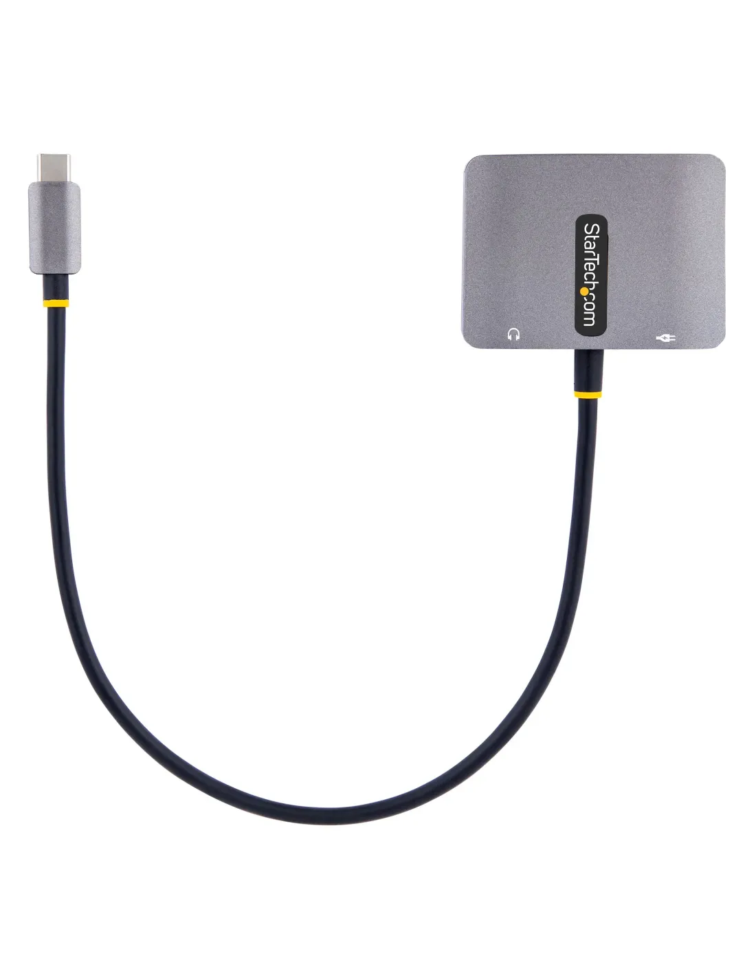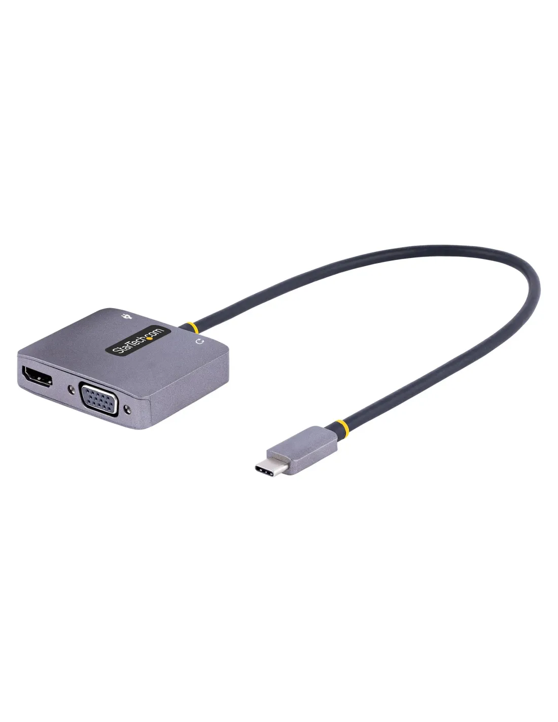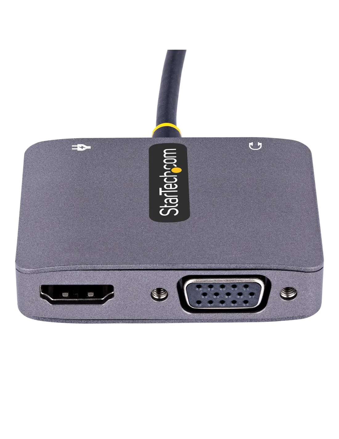 Características del Adaptador USB C a HDMI/VGA StarTech.comEl **adaptador USB C a HDMI/VGA de StarTech.com** es una solución de conectividad compacta y potente, diseñada para ampliar las opciones de visualización de tu laptop o dispositivo compatible. Con soporte para resoluciones de hasta **4K a 60 Hz**, este adaptador te permite conectar tu dispositivo a pantallas externas mediante **HDMI** o **VGA**, y disfrutar de un sonido de alta calidad a través de su **salida de audio de 3.5 mm**. Además, incluye **USB-C Power Delivery 3.0**, permitiéndote cargar tu dispositivo mientras usas el adaptador, todo sin necesidad de complicados cables adicionales.### Conexión versátil y alta resoluciónEste adaptador multiport tiene múltiples salidas, permitiéndote conectar tu dispositivo a **pantallas HDMI** o **VGA**, ideal para diferentes tipos de monitores y proyectores. Soporta **resoluciones de hasta 3840 x 2160 a 60 Hz** a través de HDMI, mientras que la salida VGA alcanza resoluciones de hasta **1920 x 1200 a 60 Hz**. Además, es compatible con **HDR**, ofreciendo una experiencia visual de mayor calidad con colores más vibrantes y detalles más nítidos.- Resolución máxima HDMI: 3840 x 2160 a 60 Hz - Resolución máxima VGA: 1920 x 1200 a 60 Hz - Compatible con **HDR** para colores vibrantes y detalles nítidos### Alimentación y carga mediante USB-C Power Delivery 3.0El **USB-C Power Delivery 3.0** integrado permite una carga eficiente de hasta **100 W**, lo que te proporciona una **alimentación continua** para tu dispositivo mientras lo conectas a una pantalla externa. De este modo, no tienes que preocuparte por desconectar el adaptador para cargar tu laptop u otro dispositivo, facilitando el trabajo en entornos donde la movilidad es clave.- Suministro de energía de **100 W** (paso a través) - Compatible con **USB Power Delivery 3.0** - Carga mientras usas el adaptador sin interrupciones### Conectividad de audio y facilidad de usoGracias a su **salida de audio de 3.5 mm**, este adaptador también te permite conectar altavoces o auriculares, brindándote una solución todo-en-uno para multimedia. El diseño **Plug and Play** hace que la instalación sea rápida y sencilla, sin necesidad de controladores adicionales. Simplemente conéctalo a tu dispositivo compatible y comienza a disfrutar de tu configuración de pantalla extendida.- Salida de audio **mini-phone estéreo de 3.5 mm** - **Plug and Play**: No requiere instalación de controladores - Cable USB-C integrado de **30 cm** para fácil conexión ---Otras especificacionesColor de caja: GrisDimensiones del adaptador: 6 cm (ancho) x 4.5 cm (profundidad) x 1.4 cm (alto)Peso del adaptador: 41 gGarantía limitada de 3 añosCumple con las normativas **HDCP 2.2**, **USB Power Delivery 3.0**, **RoHS**, y **WEEE**Temperatura mínima de funcionamiento: 0°CTemperatura máxima de funcionamiento: 45°CIncluye cable USB-C integrado de 30 cm