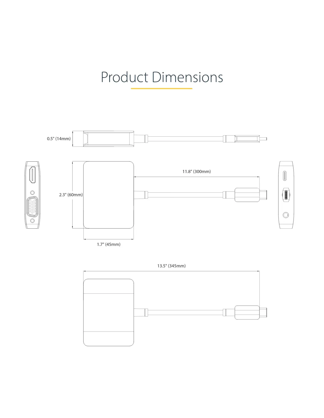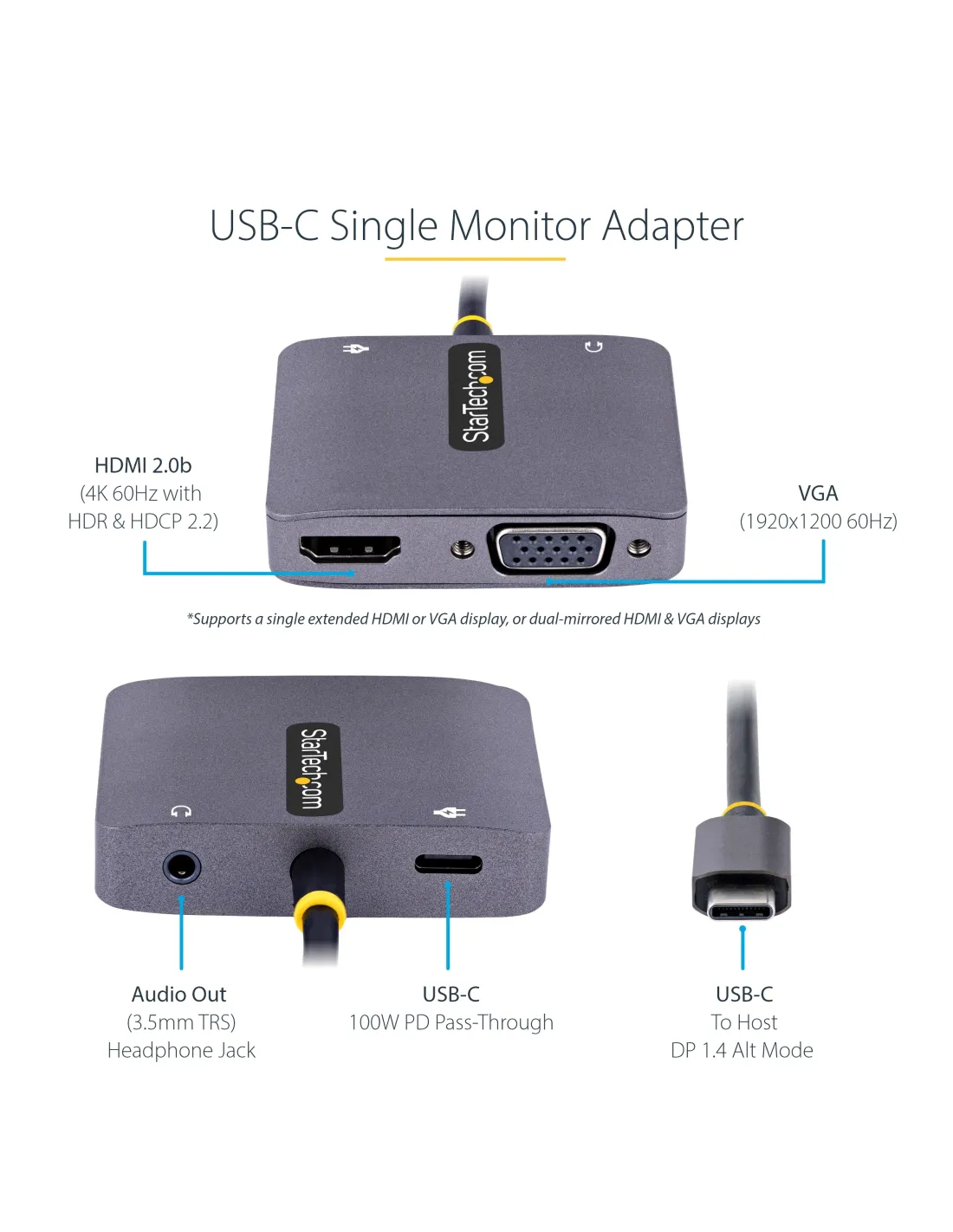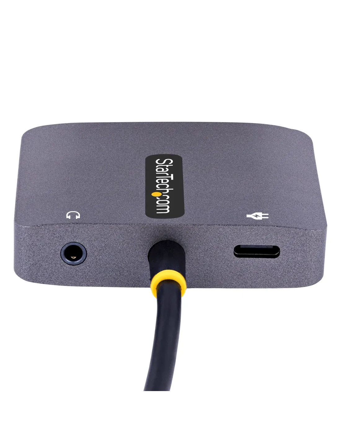 Características del Adaptador USB C a HDMI/VGA StarTech.comEl **adaptador USB C a HDMI/VGA de StarTech.com** es una solución de conectividad compacta y potente, diseñada para ampliar las opciones de visualización de tu laptop o dispositivo compatible. Con soporte para resoluciones de hasta **4K a 60 Hz**, este adaptador te permite conectar tu dispositivo a pantallas externas mediante **HDMI** o **VGA**, y disfrutar de un sonido de alta calidad a través de su **salida de audio de 3.5 mm**. Además, incluye **USB-C Power Delivery 3.0**, permitiéndote cargar tu dispositivo mientras usas el adaptador, todo sin necesidad de complicados cables adicionales.### Conexión versátil y alta resoluciónEste adaptador multiport tiene múltiples salidas, permitiéndote conectar tu dispositivo a **pantallas HDMI** o **VGA**, ideal para diferentes tipos de monitores y proyectores. Soporta **resoluciones de hasta 3840 x 2160 a 60 Hz** a través de HDMI, mientras que la salida VGA alcanza resoluciones de hasta **1920 x 1200 a 60 Hz**. Además, es compatible con **HDR**, ofreciendo una experiencia visual de mayor calidad con colores más vibrantes y detalles más nítidos.- Resolución máxima HDMI: 3840 x 2160 a 60 Hz - Resolución máxima VGA: 1920 x 1200 a 60 Hz - Compatible con **HDR** para colores vibrantes y detalles nítidos### Alimentación y carga mediante USB-C Power Delivery 3.0El **USB-C Power Delivery 3.0** integrado permite una carga eficiente de hasta **100 W**, lo que te proporciona una **alimentación continua** para tu dispositivo mientras lo conectas a una pantalla externa. De este modo, no tienes que preocuparte por desconectar el adaptador para cargar tu laptop u otro dispositivo, facilitando el trabajo en entornos donde la movilidad es clave.- Suministro de energía de **100 W** (paso a través) - Compatible con **USB Power Delivery 3.0** - Carga mientras usas el adaptador sin interrupciones### Conectividad de audio y facilidad de usoGracias a su **salida de audio de 3.5 mm**, este adaptador también te permite conectar altavoces o auriculares, brindándote una solución todo-en-uno para multimedia. El diseño **Plug and Play** hace que la instalación sea rápida y sencilla, sin necesidad de controladores adicionales. Simplemente conéctalo a tu dispositivo compatible y comienza a disfrutar de tu configuración de pantalla extendida.- Salida de audio **mini-phone estéreo de 3.5 mm** - **Plug and Play**: No requiere instalación de controladores - Cable USB-C integrado de **30 cm** para fácil conexión ---Otras especificacionesColor de caja: GrisDimensiones del adaptador: 6 cm (ancho) x 4.5 cm (profundidad) x 1.4 cm (alto)Peso del adaptador: 41 gGarantía limitada de 3 añosCumple con las normativas **HDCP 2.2**, **USB Power Delivery 3.0**, **RoHS**, y **WEEE**Temperatura mínima de funcionamiento: 0°CTemperatura máxima de funcionamiento: 45°CIncluye cable USB-C integrado de 30 cm