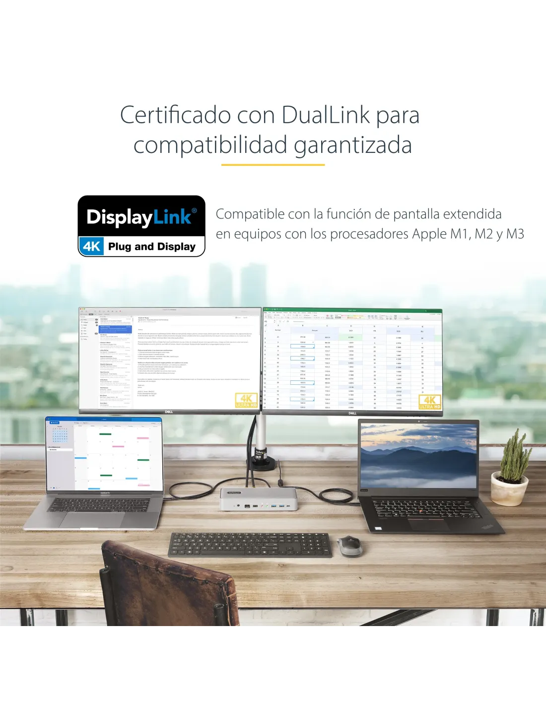 Características de la StarTech.com Dual-Laptop USB-C KVM Docking StationLa estación de conexión **StarTech.com USB-C Dual-Laptop KVM** está diseñada para profesionales que trabajan con **dos portátiles simultáneamente** y necesitan cambiar entre ellos sin perder conectividad. Con soporte para **dos monitores 4K a 60 Hz**, hasta **5 puertos USB**, conexión Ethernet Gigabit y **entrega de energía inteligente (90 W + 45 W)**, es una solución completa para entornos de trabajo exigentes y versátiles. Compatible con **Windows, macOS, Linux y ChromeOS**, esta base se convierte en el centro neurálgico de tu espacio de trabajo.Conmutación KVM dual con selección de hostGracias a su sistema KVM integrado, puedes alternar el control entre **dos portátiles** conectados por USB-C, sin necesidad de cambiar cables o periféricos. Esto permite trabajar con máxima eficiencia y rapidez, especialmente en configuraciones IT, laboratorios o multitarea avanzada.Botón físico de selección de hostSoporte KVM para periféricos y pantallasEntrega de energía: 90 W al equipo activo / 45 W al de reservaConectividad 4K y amplio soporte de puertosLa base permite conectar **dos pantallas 4K a 60 Hz** mediante DisplayPort, ideal para tareas que requieren alta resolución y fluidez. Además, ofrece conexiones USB-A, USB-C, audio, red y más, todo desde un único dispositivo.2 x DisplayPort 1.4 (hasta 4096 x 2160 a 60 Hz)2 x USB 3.2 Gen 2 Tipo A + 2 x USB 2.01 x USB-C 3.2 Gen 2 adicional (10 Gbps)Diseño compacto y compatible con sistemas actualesCon un formato reducido y carcasa resistente, esta docking station es ideal para escritorios profesionales. Además, cumple con los estándares de eficiencia y sostenibilidad.Dimensiones: 22,4 x 9 x 4 cm / Peso: 402 gCompatible con Windows 10/11, macOS 10.15 a 14.0, Ubuntu, ChromeOSCarcasa plástica con ranura de seguridad KensingtonRed Ethernet y alimentación eficienteIncluye un puerto RJ-45 Gigabit para conexiones de red estables y rápidas, ideal para oficinas, videollamadas o transferencia de datos pesada. Su alimentador de 180 W garantiza un rendimiento constante para todos los dispositivos conectados.Ethernet 10/100/1000 MbpsAdaptador de corriente CA 100-240 V / DC 20 VConsumo máximo: 180 WOtras especificacionesCables incluidos: 2 x USB-C de 1 metroCertificaciones: DisplayLink, RoHS, WEEE, USB PD 3.0, UASPIndicador LED de estadoTemperatura de funcionamiento: -10 °C a 45 °CCompatible TAA
