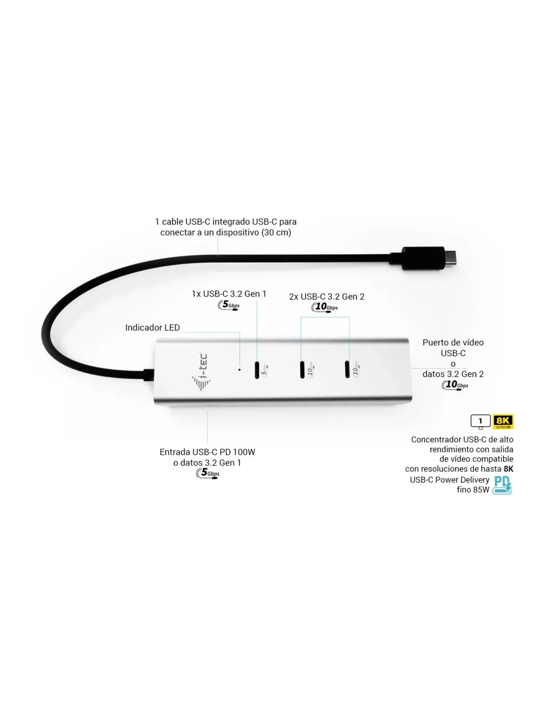 Características del CHARGE Metal Hub 5 Puertos USB-C 8K 85WEl **CHARGE Metal Hub de 5 puertos USB-C** está diseñado para usuarios que necesitan una solución de conectividad compacta, potente y compatible con las tecnologías más recientes. Ideal para profesionales, creadores de contenido y entornos multitarea, este hub combina velocidad, soporte de resoluciones avanzadas y suministro de energía eficiente en un diseño metálico resistente y elegante.Conectividad avanzada con USB-C de alto rendimientoEste hub incluye un total de 5 puertos USB-C, que ofrecen compatibilidad con diferentes dispositivos y periféricos de forma simultánea. Su tecnología de transferencia alcanza velocidades de hasta 10 Gbps, lo que garantiza una transmisión de datos rápida y fluida, incluso en tareas exigentes.3 x USB-C 3.2 Gen 2 para transferencia de alta velocidad1 x USB-C 3.2 Gen 11 x USB-C 3.2 Gen 1 con suministro de energía (Power Delivery) de hasta 85WSoporte de resolución 8K y tecnologías visualesEl hub permite salida de vídeo con resoluciones de hasta 8K a 30 Hz y 4K a 144 Hz, ideal para pantallas de alta definición, monitores gaming y estaciones de trabajo gráficas. Gracias al modo DisplayPort Alternate y la compatibilidad con AMD FreeSync, disfrutarás de una experiencia visual fluida y sin cortes.Resolución máxima: 8K a 30HzCompatible con 4K a 144HzSoporte DisplayPort Alt Mode y AMD FreeSyncDiseño metálico y compatibilidad universalConstruido en una carcasa metálica resistente, el hub ofrece durabilidad y disipación térmica eficiente. Es compatible con una amplia gama de sistemas operativos, lo que lo convierte en una opción versátil para usuarios de Windows, Mac, Android y más.Plug & Play, sin necesidad de driversCompatibilidad: Windows 10/11, macOS, Android, iPadOS, Chrome OS y LinuxIncluye cable USB-C de 30 cmCompacto, ligero y preparado para el día a díaGracias a su diseño compacto y peso reducido, este hub es fácil de transportar y perfecto para estaciones de trabajo portátiles o escritorios con poco espacio.Dimensiones: 11,5 x 3 x 2,1 cmPeso: 68 gIndicador LED de estado integradoOtras especificacionesCumplimiento de normas: USB 3.1 Gen 1 / Gen 2Normativa adicional: Plug and Play