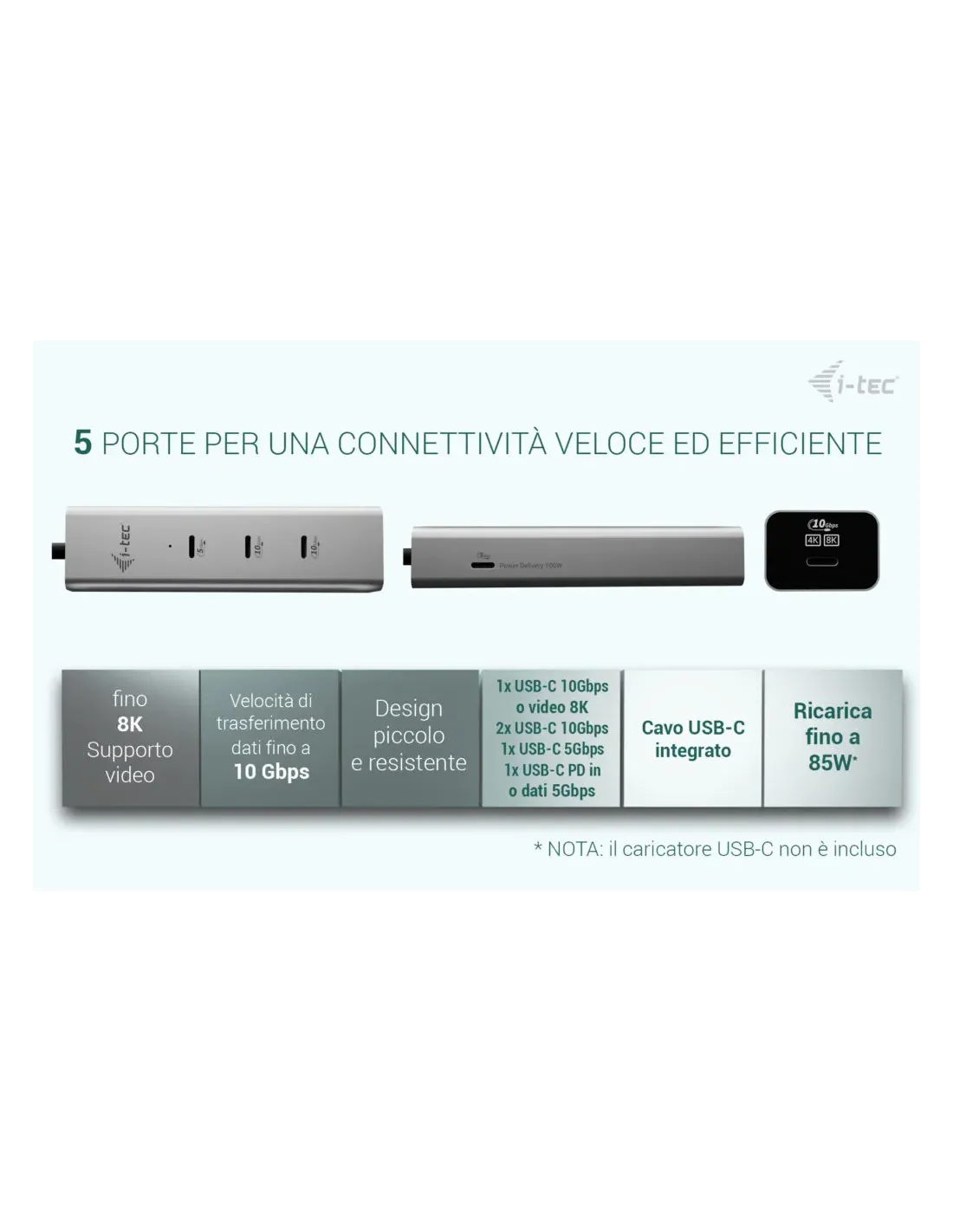 i-tec Metal USB-C Charging HUB 5port with USB-C video 8K + Power Delivery 85W, USB Tipo C, USB Tipo C, 10000 Mbit/s, 144 Hz, Plata, 85 W