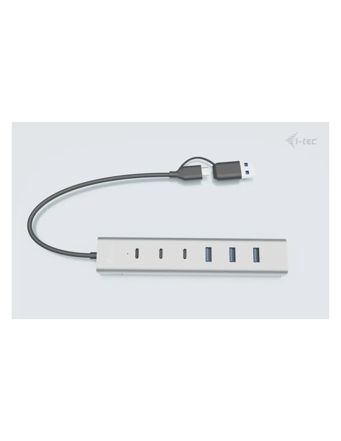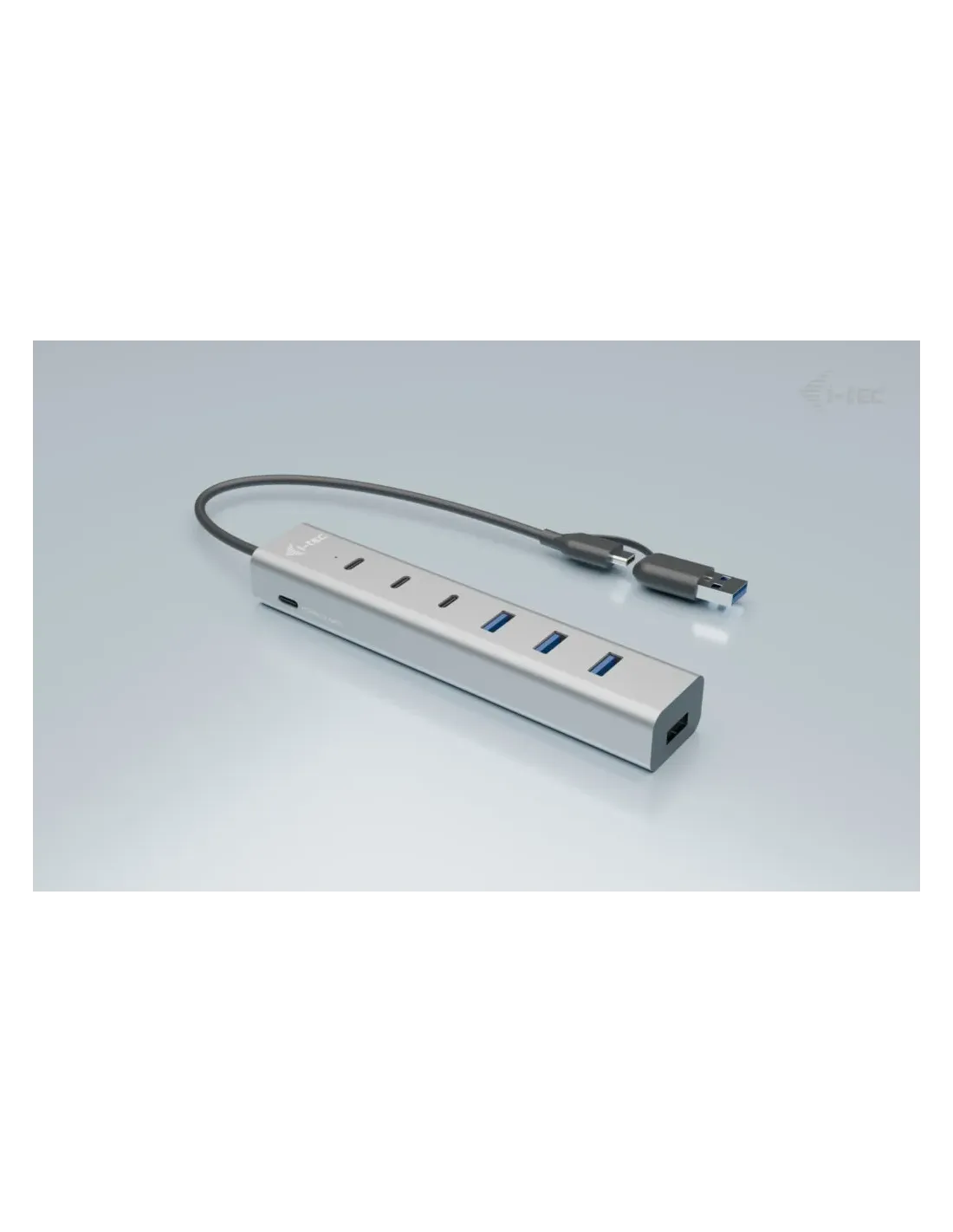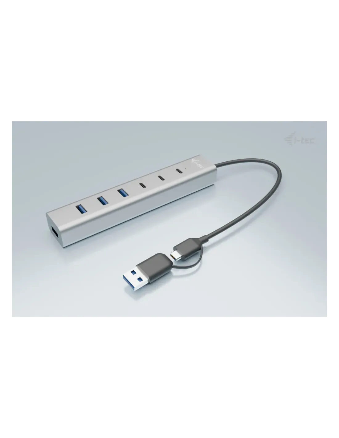Características del Hub i-tec USB-C/USB-A Charging Metal HUB 7 PuertosEl **hub metálico i-tec USB-C/USB-A de 7 puertos** es una solución versátil y compacta para quienes necesitan **expandir la conectividad de sus dispositivos USB** en entornos de trabajo, estudio o uso doméstico. Diseñado en una carcasa de aluminio resistente y ligera, este concentrador permite cargar y transferir datos de manera eficiente gracias a su alimentación externa y a su compatibilidad con **puertos USB-A y USB-C**. Ideal para portátiles modernos, estaciones de trabajo y equipos híbridos.Conectividad ampliada y eficienteEste hub está equipado con una combinación inteligente de **7 puertos USB**, que incluye **3 USB-C** y **4 USB-A**, ofreciendo gran flexibilidad para conectar periféricos actuales y legados. Su estructura de aluminio no solo proporciona durabilidad, sino también una excelente disipación del calor.3 puertos USB-C + 4 puertos USB-AVelocidad de transferencia de hasta 5.000 Mbit/sCompatible con dispositivos modernos y tradicionalesAlimentación independiente y diseño compactoGracias a su **alimentación externa de 12V/3A**, este hub puede alimentar varios dispositivos simultáneamente sin comprometer el rendimiento, incluso cuando se conectan periféricos exigentes como discos duros externos o cargadores. Además, su diseño metálico ultracompacto facilita su transporte y uso diario.Alimentación por corriente continua: 12 V / 3 ACarcasa de aluminio resistente y ligeraIdeal para escritorios, oficinas o viajesDiseño minimalista y portabilidadSu tamaño reducido y peso ligero hacen que sea fácil de transportar junto al portátil o tableta. El acabado metálico le da un toque profesional, mientras que su cable de conexión de 30 cm ofrece la longitud justa para evitar enredos o exceso de cableado.Dimensiones: 157 × 30 × 21 mmPeso: 21 gLongitud del cable: 30 cmCompatibilidad sin complicacionesNo requiere instalación de drivers ni software adicional. Solo conéctalo y empieza a utilizarlo de inmediato con cualquier equipo que disponga de puertos USB-A o USB-C.Plug & Play: sin software incluido ni necesarioCompatible con Windows, macOS, Linux y otros sistemasIdeal para usuarios de portátiles ultrafinos sin muchos puertosOtras especificacionesEstándar USB: Multipuerto Type-CColor del chasis: Aluminio