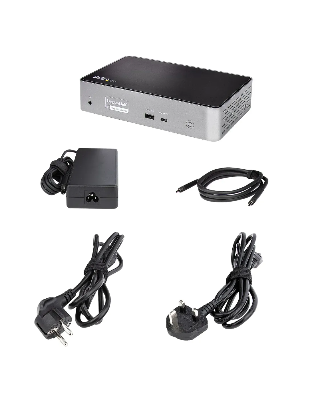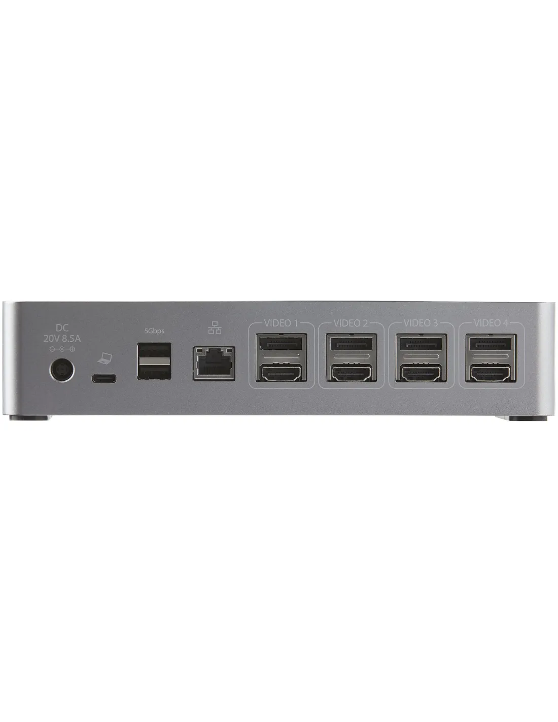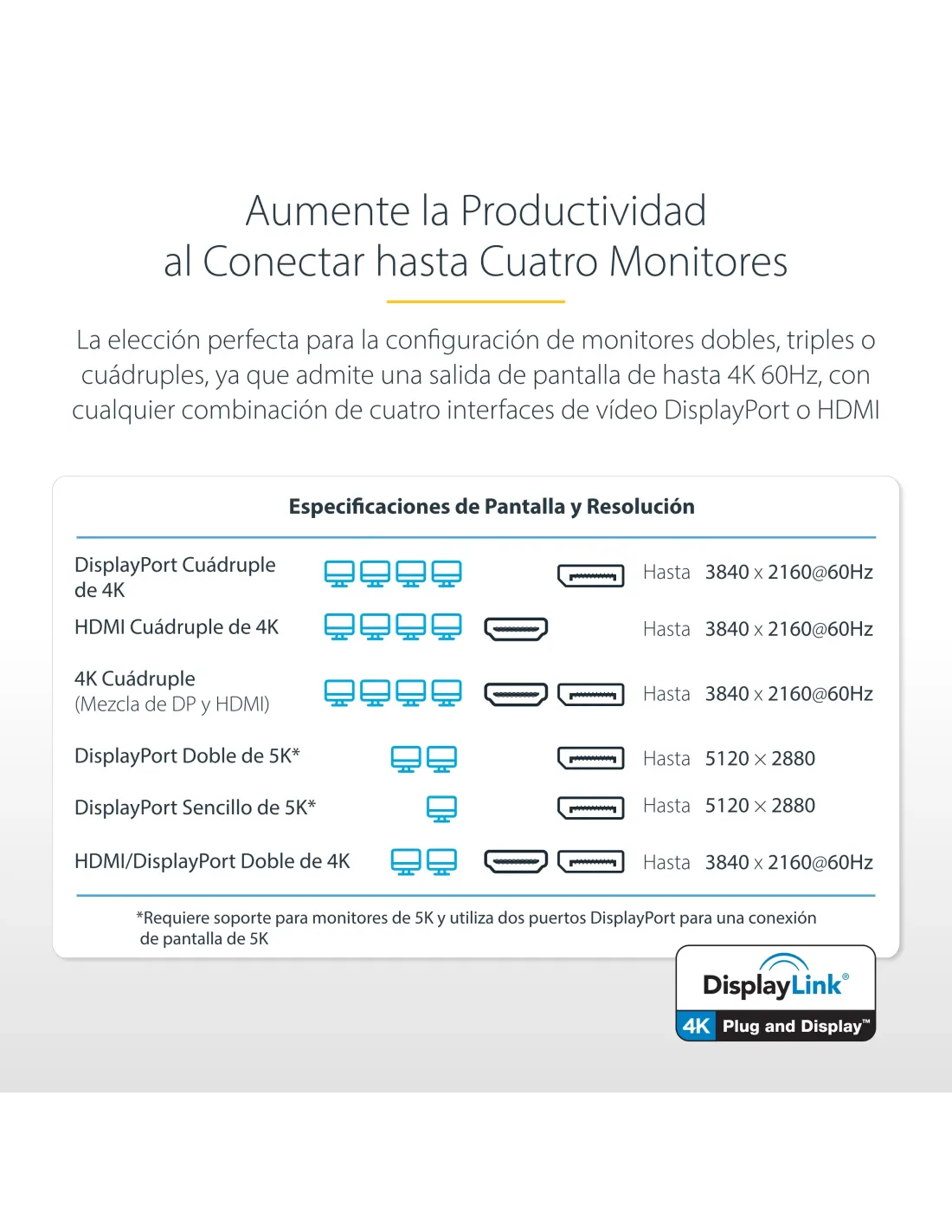 -TIPO DE PRODUCTOEstación de conexión-ANCHURA9 cm-PROFUNDIDAD21.5 cm-ALTURA4.65 cm-PESO330 g-LOCALIZACIÓNEuropaReino Unido-COLOR DE CAJANegroGris espacio-INTERFACES4 x salida DisplayPort (DisplayPort de 20 patillas)4 x salida HDMI (HDMI de 19 patillas tipo A)1 x auriculares/micrófono (miniteléfono 3.5 mm de 4 polos)1 x USB 3.2 Gen 1 con carga de batería 1.2 (USB Tipo A de 9 clavijas)1 x USB-C 3.2 Gen 2 (24 pin USB-C)1 x USB-C 3.2 Gen 2 con Power Delivery (100 W) (24 pin USB-C)2 x USB 3.2 Gen 1 (USB Tipo A de 9 clavijas)1 x RJ-45 (10Base-T/100Base-TX/1000Base-T)-TIPO DE RANURA DE SEGURIDADRanura de seguridad Kensington-CABLES INCLUIDOS1 x cable USB-C (externo, 1 m)-CARACTERÍSTICASRanura de bloqueo de seguridad (bloqueo de cable de venta por separado)Compatibilidad con entorno de ejecución de prearranque (PXE)Entrega de potencia de 100 WWake on LAN-CUMPLIMIENTO DE NORMASUSB Battery Charging Specification Rev. 1.2USB Power DeliveryDisplayPort 1.2DisplayLink Plug and DisplayUSB-IF-CONEXIÓN DE REDESProtocolo de interconexión de datos: Ethernet, Fast Ethernet, Gigabit Ethernet-ALIMENTACIÓNDispositivo de alimentación: Adaptador de corrienteVoltaje necesario: CA 110-240 V-PARÁMETROS DE ENTORNOTemperatura mínima de funcionamiento: 0 °CTemperatura máxima de funcionamiento: 50 °C-DETALLES DE RESOLUCIÓN MÁXIMA5120 x 2880 (pantalla dual con DisplayPort 1.2)3840 x 2160 - 60 Hz (pantalla cuádruple)-SISTEMA OPERATIVO REQUERIDOMicrosoft Windows 10 / 11Apple macOS 10.14 o posteriorGoogle Chrome OS 61 o posterior-GARANTÍA DEL FABRICANTEGarantía limitada: 3 años-DIMENSIONES Y PESO (EMBALAJE)Profundidad de embalaje: 23.1 cmAnchura de embalaje: 14.2 cmAltura de embalaje: 9.7 cmPeso de embalaje: 360 g-BENEFICIOSEstación de conexión de alto rendimiento compatible con hasta cuatro pantallasResolución máxima de 5120 x 2880 en configuración dualEntrega de potencia de hasta 100 W para carga de dispositivosCompatibilidad multiplataforma con Windows, macOS y Chrome OSAmplia conectividad para periféricos y red Gigabit EthernetIdeal para estaciones de trabajo profesionales y entornos corporativosDiseño robusto con seguridad adicional mediante ranura KensingtonCumple con estándares internacionales de calidad y sostenibilidad